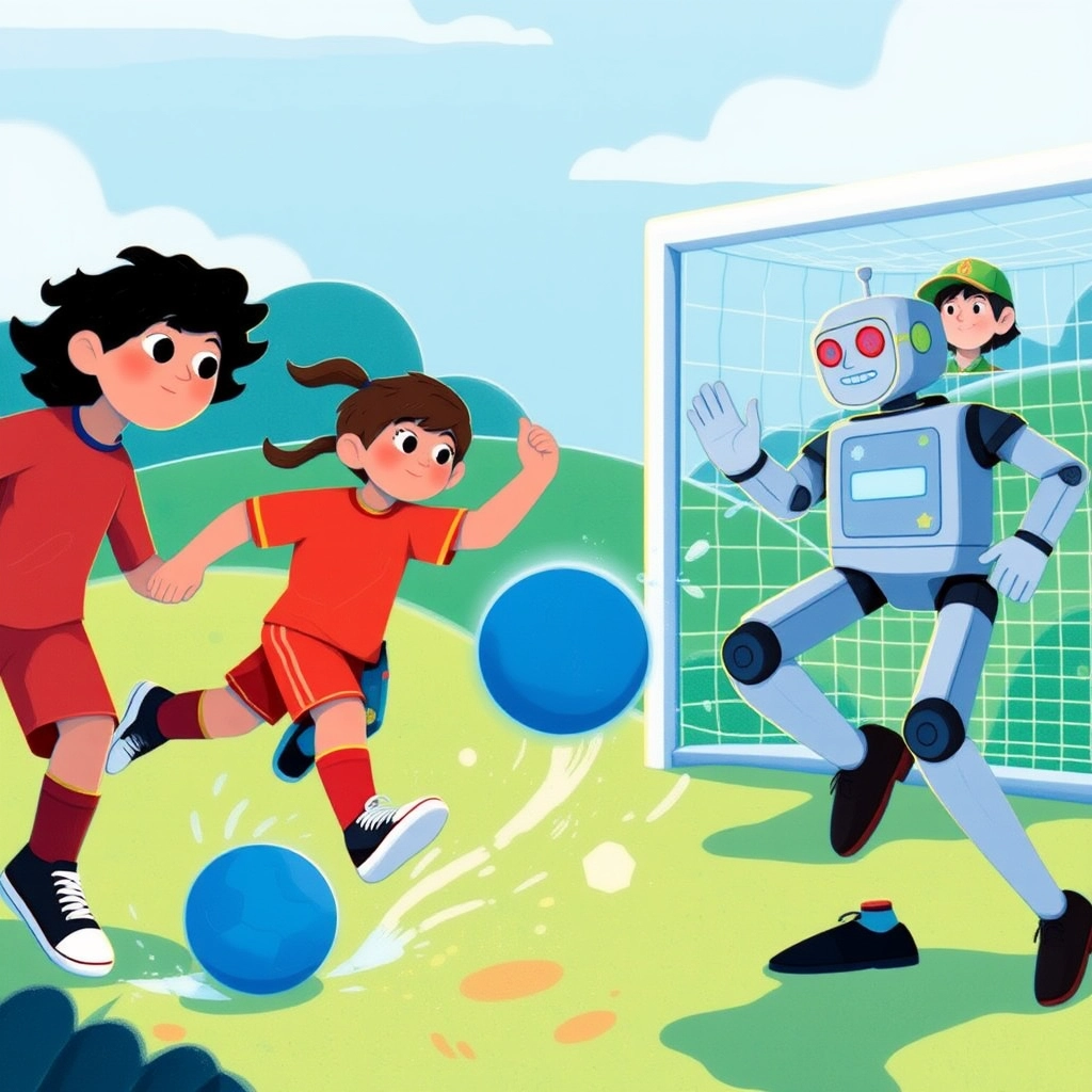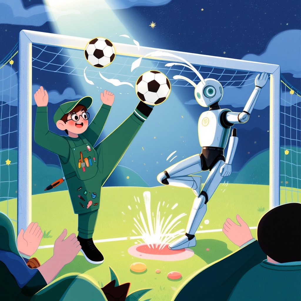 Then, [Toby](Z2M796C7) adjusted [Robo-Kicks](54DTNZVV), adding more kicks to its repertoire. [Robo-Kicks](54DTNZVV) amazed everyone with a spinning backflip kick that scored a goal!