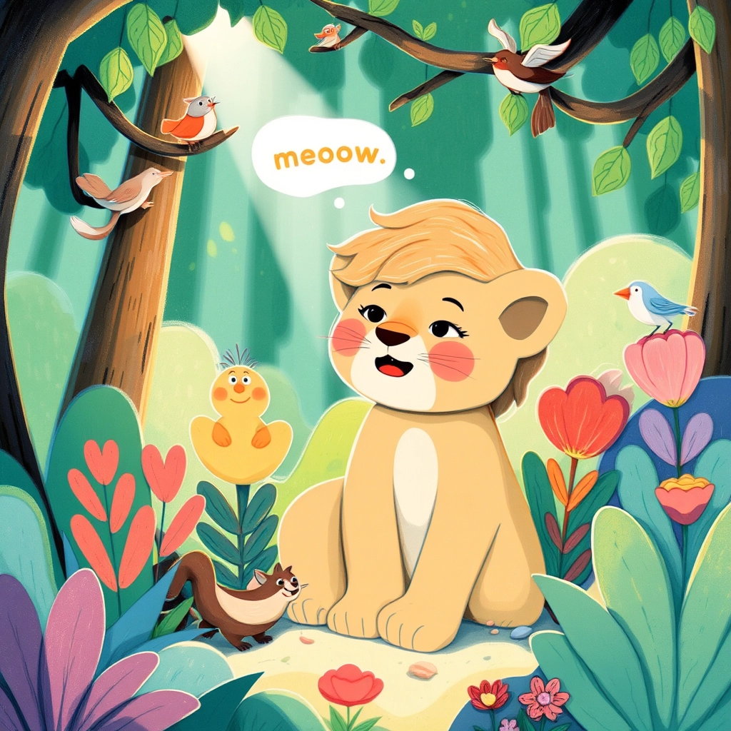 Every time [Leo](QKLRC22D) tried to roar, it came out like a soft 'meooow...' Then he would hide behind the leaves, embarrassed, while the other animals laughed.