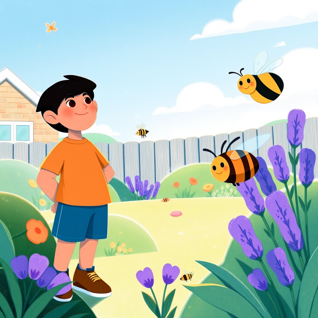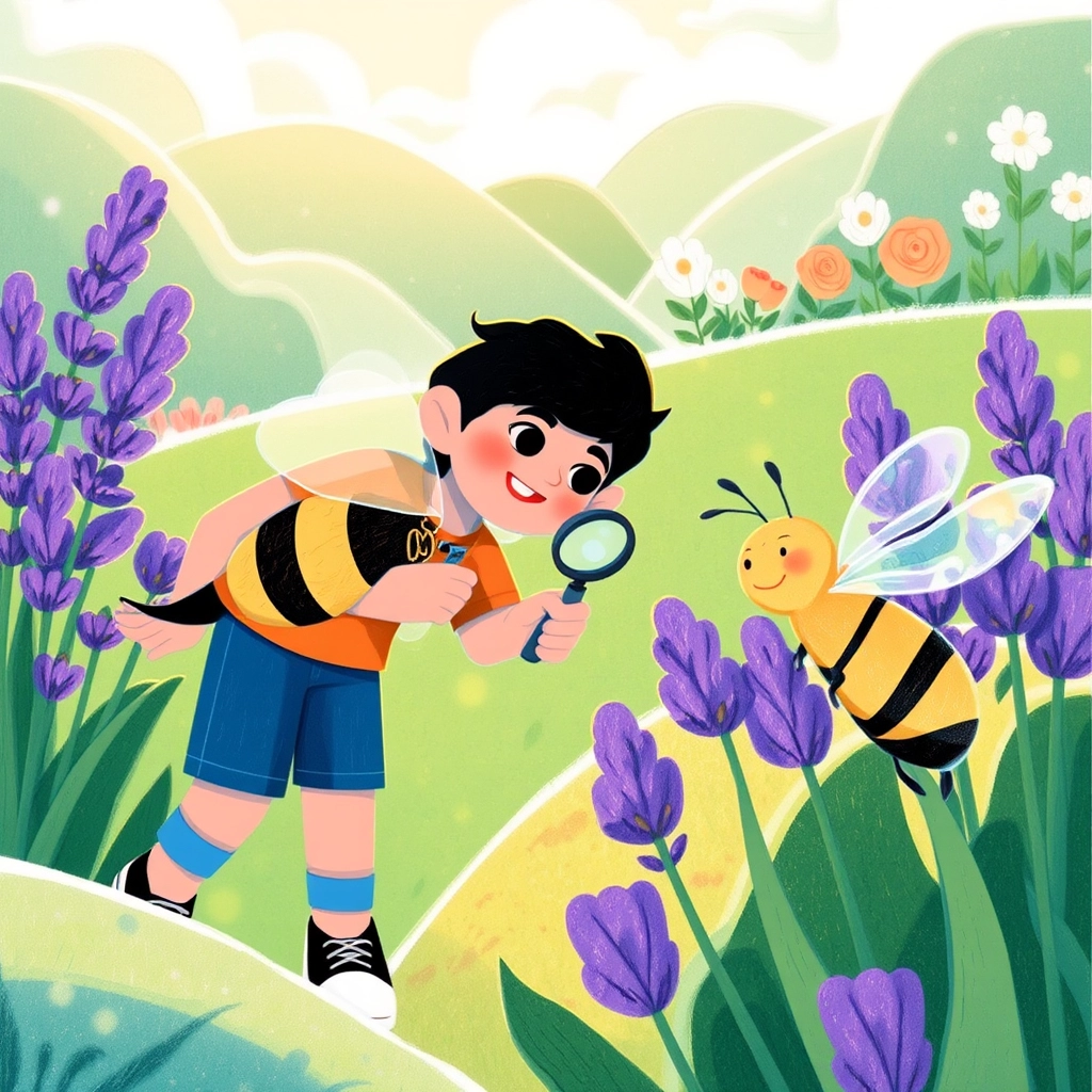 [Leonardo](5G67YDG2) stopped at a buzzing sound. A bee hovered near some lavender flowers. 'Oh! You’re gathering nectar for honey!' [Leonardo](5G67YDG2) exclaimed.