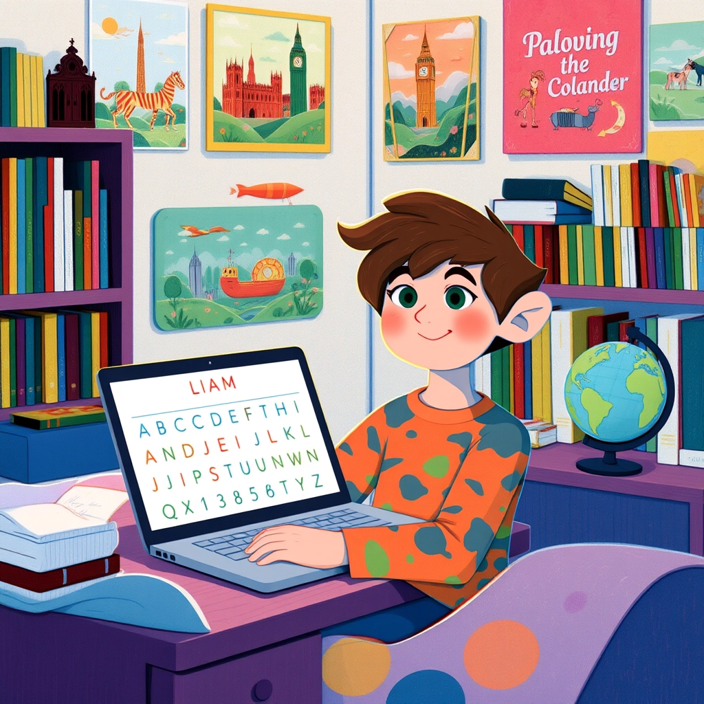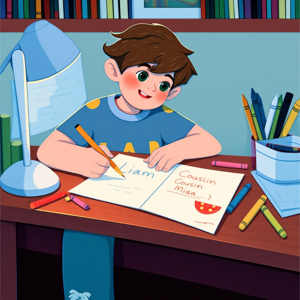 Soon, [Liam](SFLLPCYW) started writing short letters in English to his cousin who lived far away. 'Hello! My name is [Liam](SFLLPCYW). I like pizza!' he wrote with a big grin.