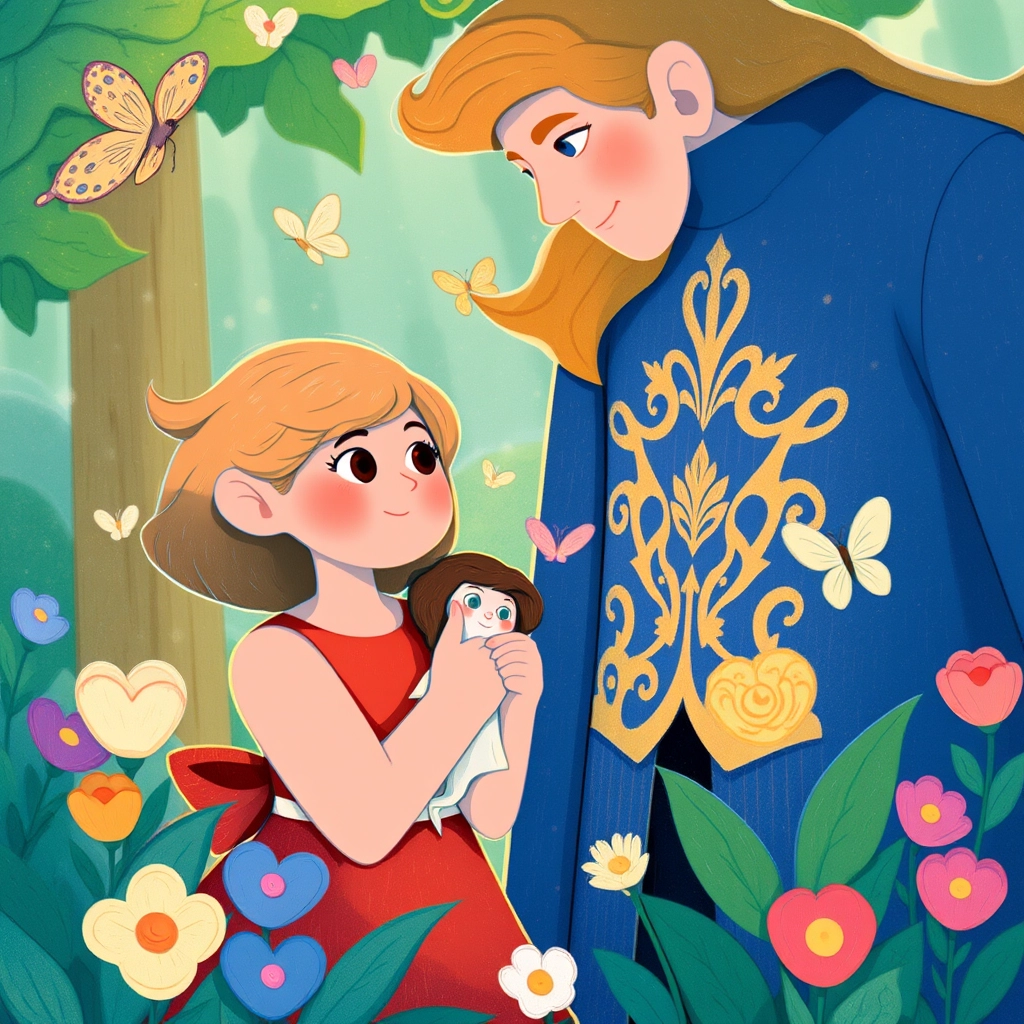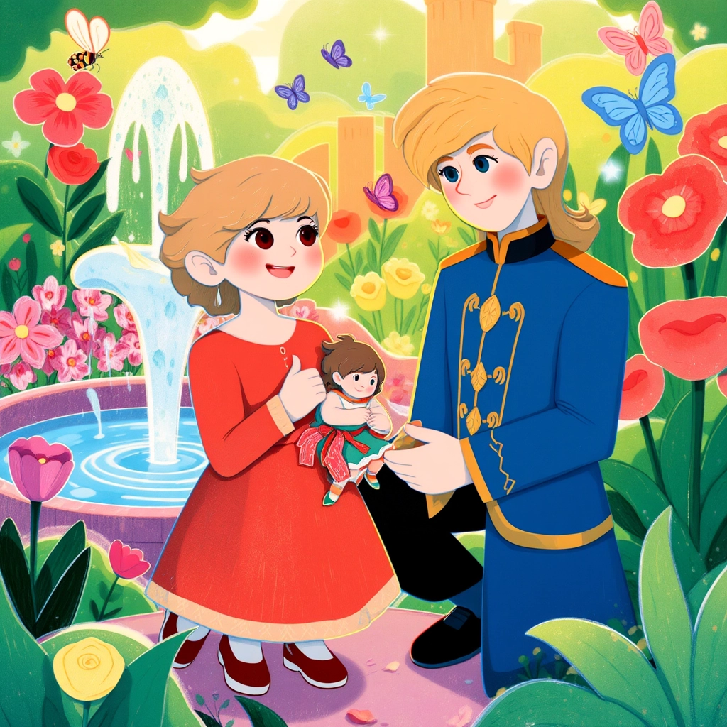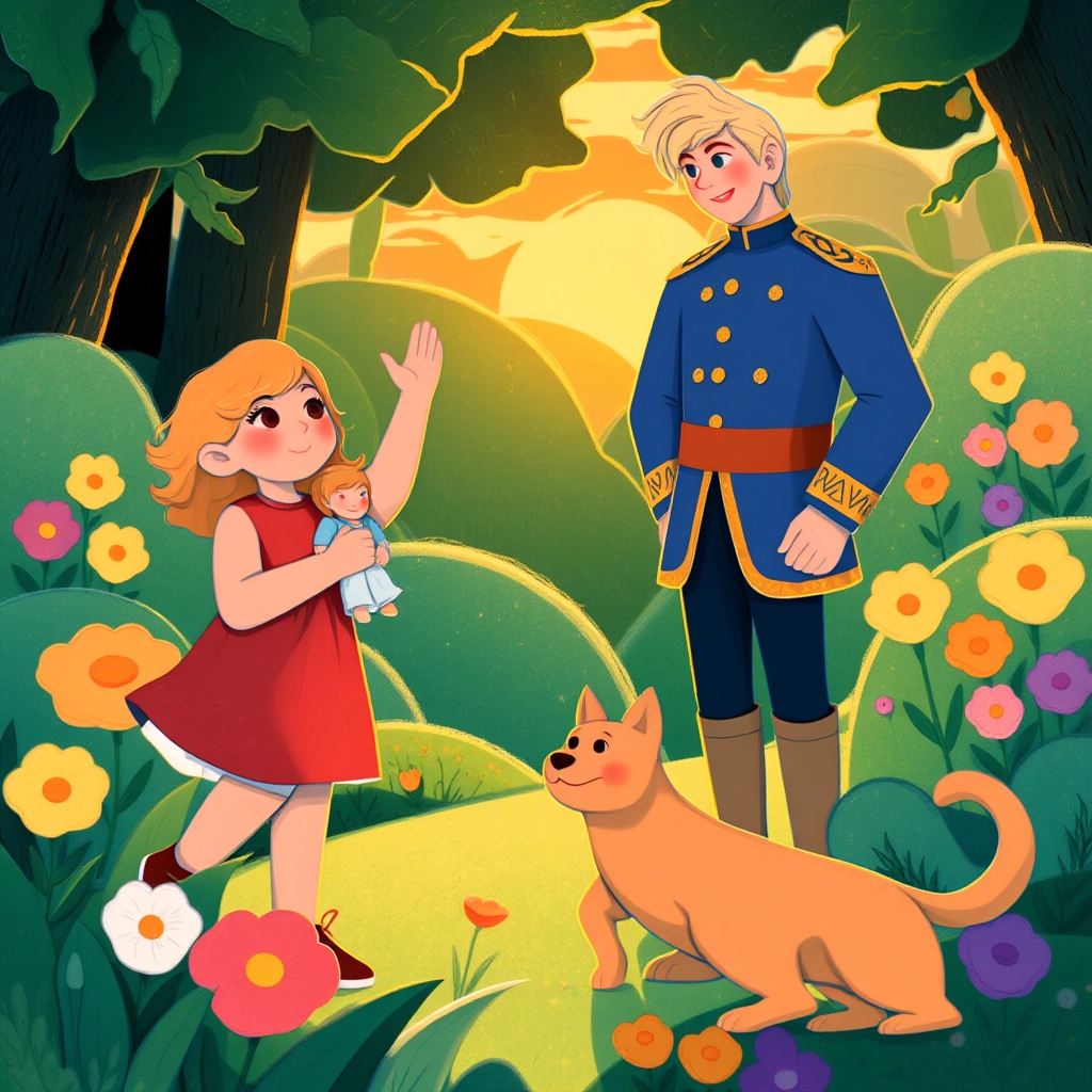 As [Lillie](BMZQV6XT) wandered through the garden, she spotted someone new—a tall, handsome prince! He had golden hair that sparkled in the sunlight and wore a royal blue outfit with shining silver buttons.