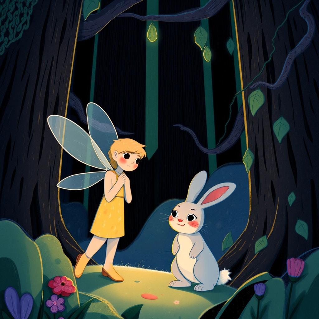 "Hello," said the bunny with a shaky voice. "I'm lost, and the forest is too dark! Can you help me find my way home?"