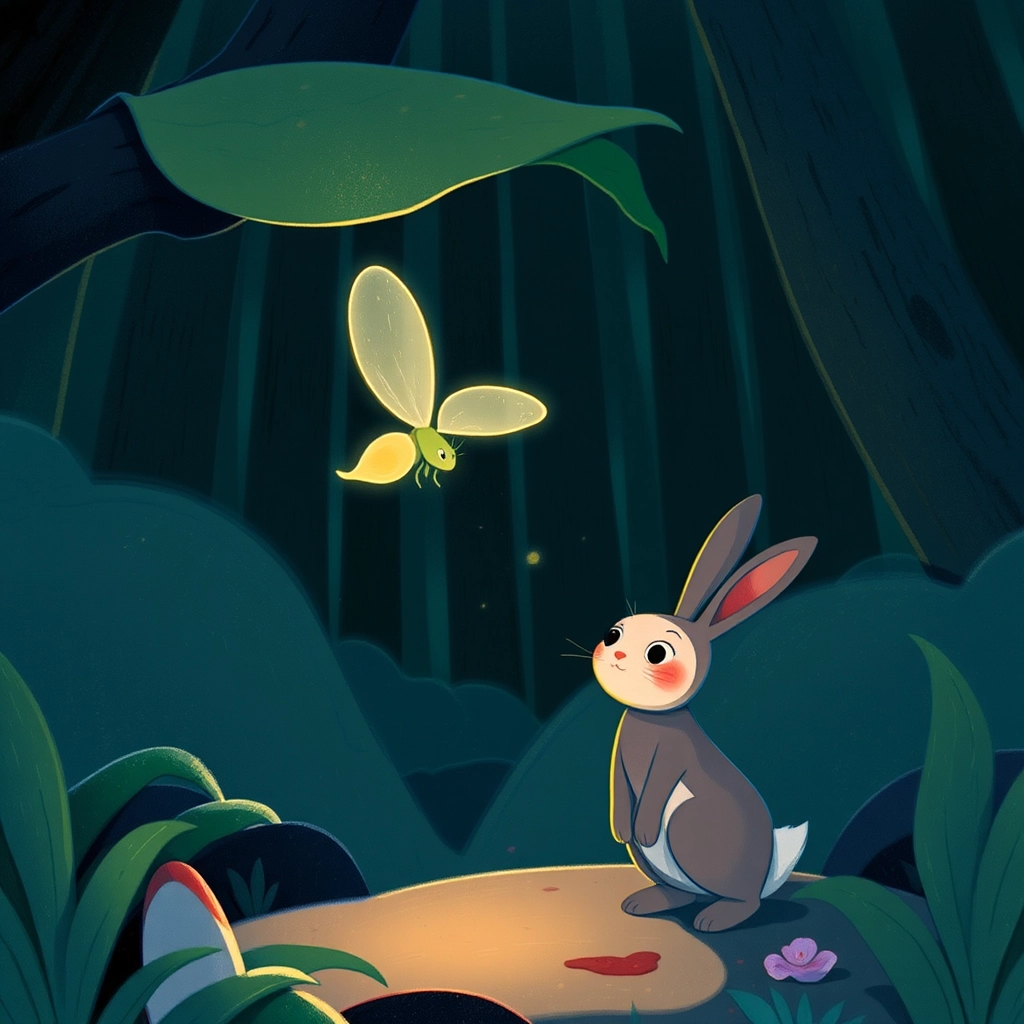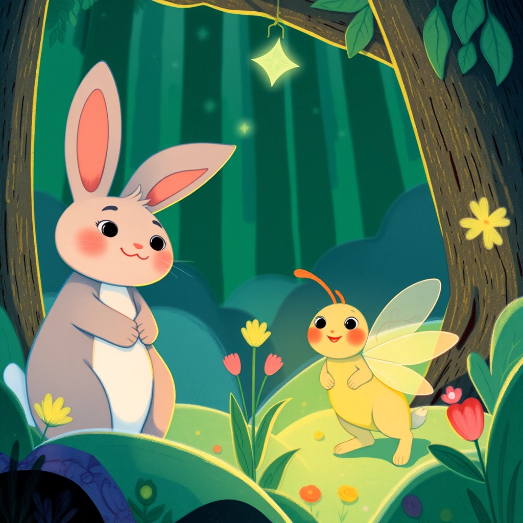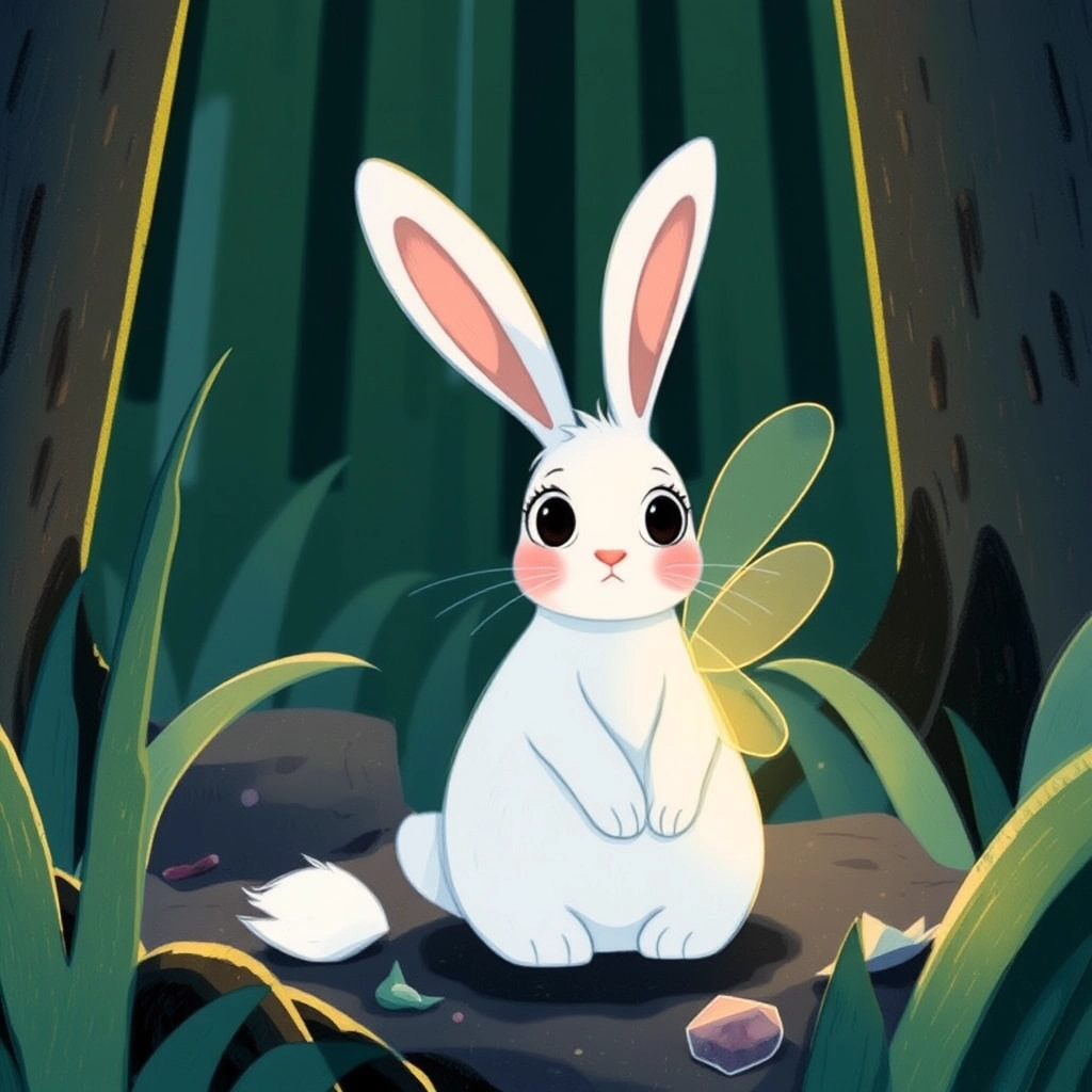 One warm summer evening, [Lily](5LVPHH3R) heard a soft sniffle. She peeked out from under her leaf and saw a tiny bunny with downy white fur and teary eyes.