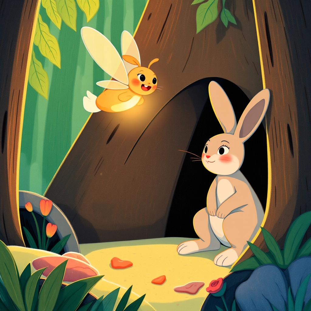 Thanks to [Lily](5LVPHH3R)'s glowing light, the bunny soon recognized his cozy burrow, nestled under an old oak tree.