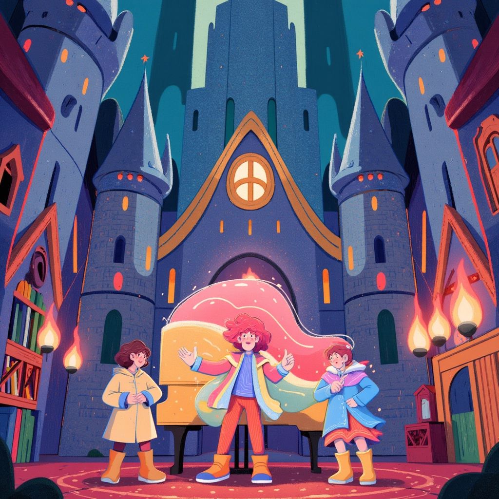 Finally, they arrived at the enchanted Toy Castle. Inside, they discovered that the Melody Key was hidden in a sparkling music box atop a grand piano.
