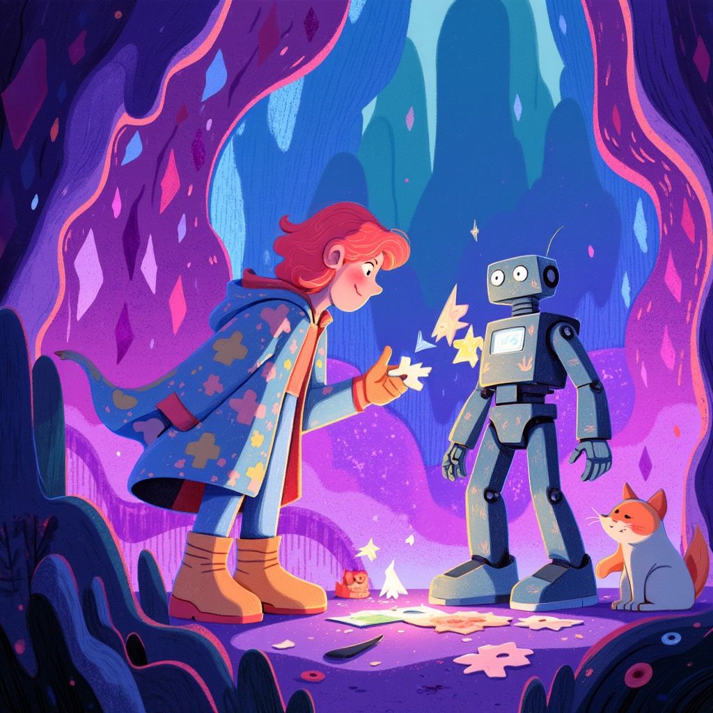 Next, they ventured into the Crystal Caves, where walls glimmered like rainbows and puzzles guarded their way. [Penny the Puzzle Robot](4XPCXXDW) solved a riddle, opening a path deeper into the magical caves.