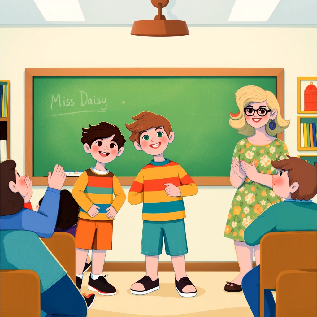 The next day, [Sam](M6N5DW4G)'s teacher, [Miss Daisy](KZXJW3KQ), praised him in front of the class. '[Sam](M6N5DW4G) is a perfect example of how saying hi and being kind can make the world better!' she said.