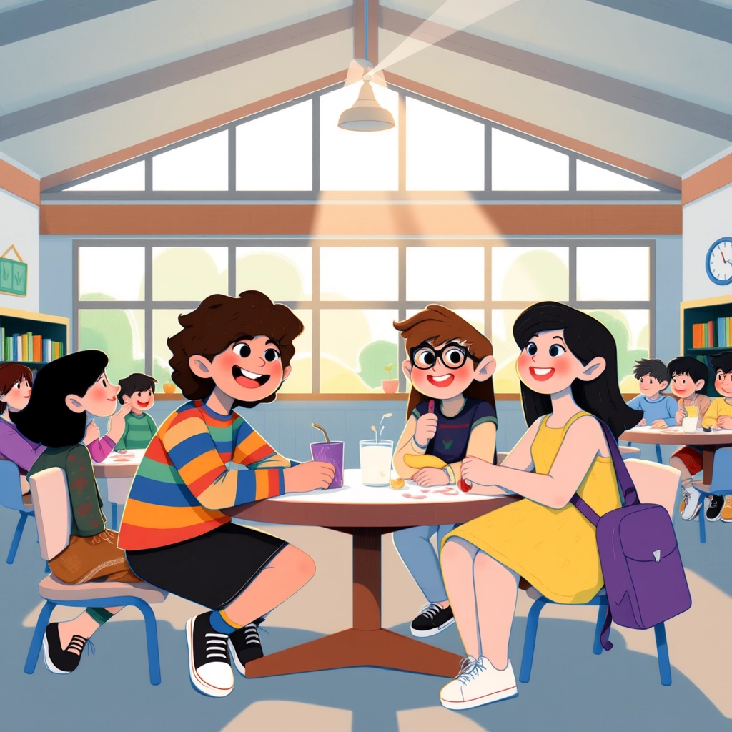 At school, [Sam](M6N5DW4G) noticed that [Mila](V4G943HW), a new student, looked nervous. He smiled and said, 'Hi, [Mila](V4G943HW)! Want to sit with us during lunch?' [Mila](V4G943HW)'s face lit up. 'Thank you!' she said shyly.
