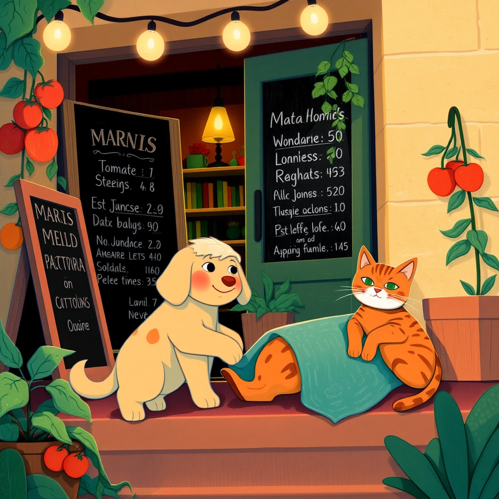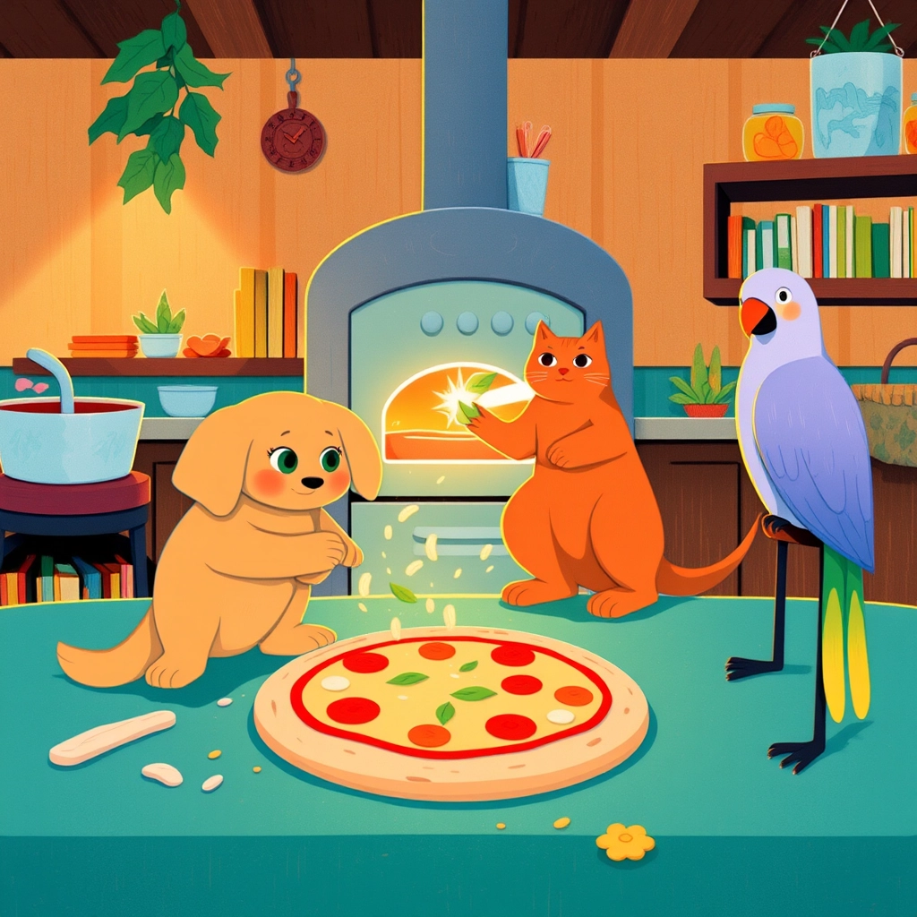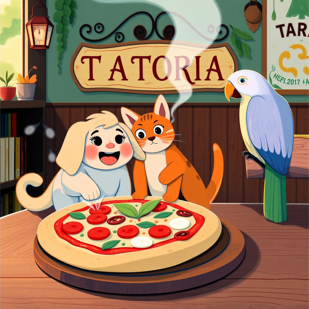 [Marco](JRCMS7P4), Mell, and [Lucia](H35KBTZM) decided to make their own pizza. At the trattoria, [Marco](JRCMS7P4) expertly kneaded dough while [Lucia](H35KBTZM) picked aromatic basil leaves. Mell wagged his tail as he sprinkled cheese!