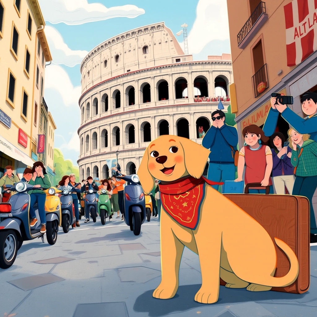 [Little Mell](MX2BPWP5) hopped off his first airplane ride in Italy. The cobbled streets of Rome sparkled, and the smell of fresh pasta filled the air. Mell's tail wagged excitedly because his big adventure was just beginning!