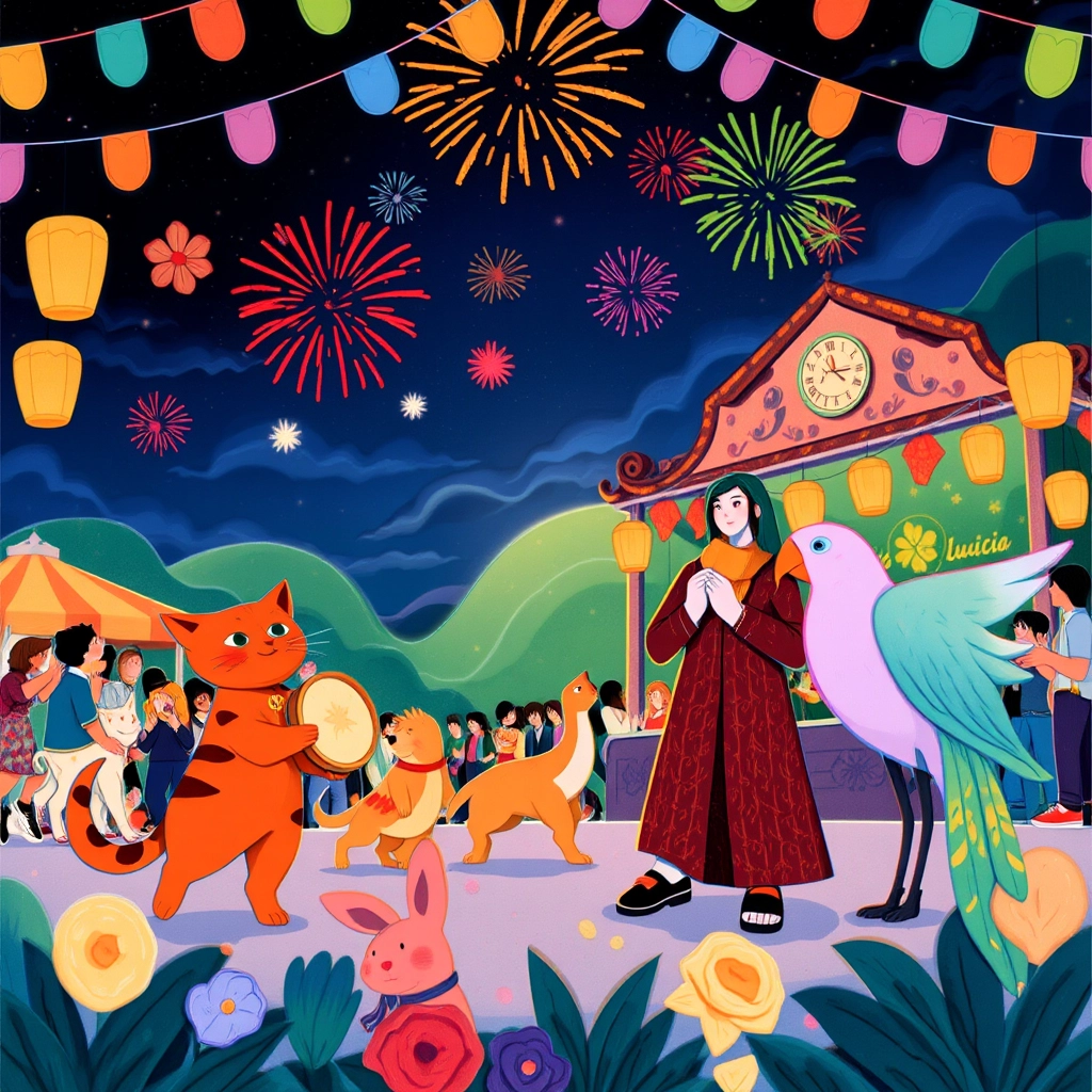 Finally, in Sicily, they danced at a festival under a sky filled with fireworks. Mell spun in circles with other puppies while [Marco](JRCMS7P4) played the tambourine and [Lucia](H35KBTZM) sang a lively tune.
