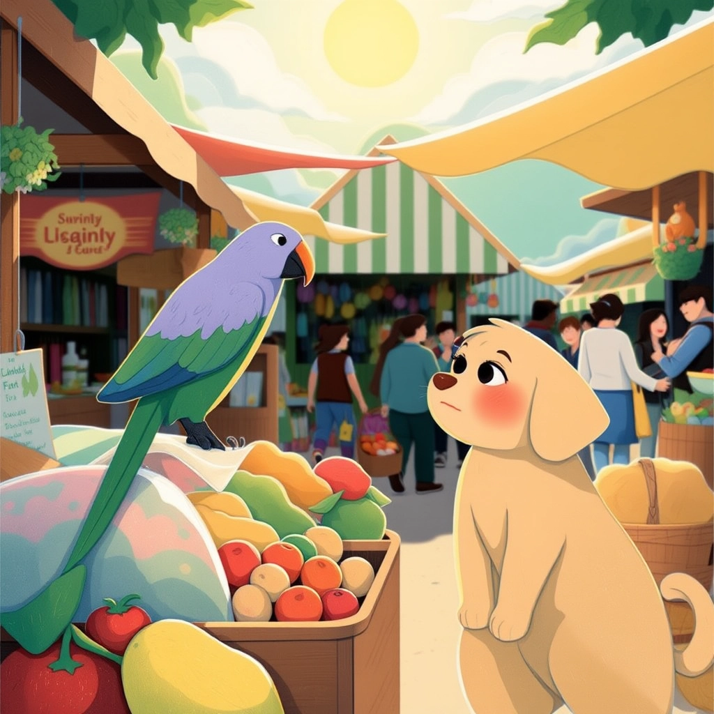 They wandered to the market, where Mell ran into [Lucia](H35KBTZM), a lavender-colored parrot. 'Buongiorno!' [Lucia](H35KBTZM) squawked as she perched on a fruit stand stacked with shiny red tomatoes and oranges.