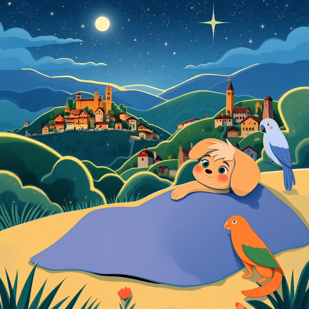 As the adventure ended, Mell thought about all the friends he'd made and the delicious food he'd tried. 'Italy is magical,' he said, his tail wagging as he looked up at the stars.