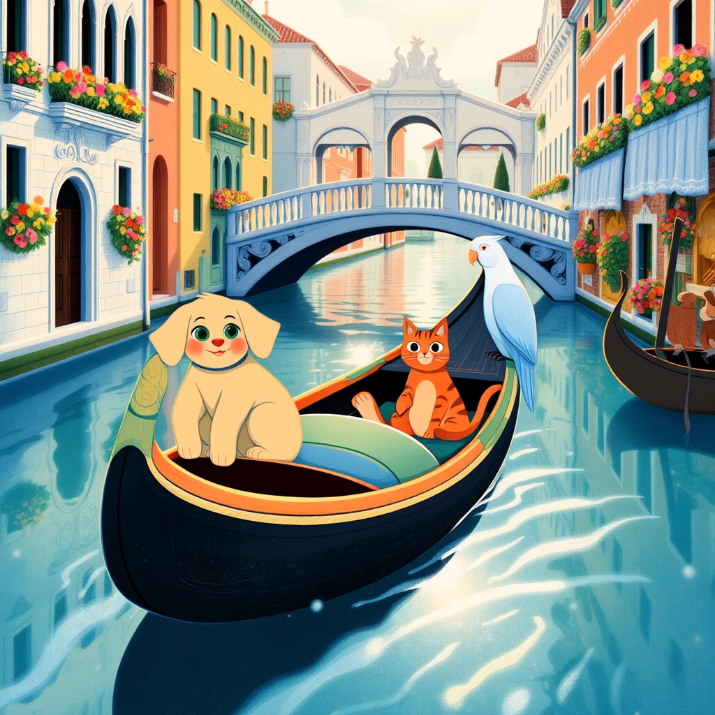 Next stop, Venice! Mell hopped on a gondola with [Lucia](H35KBTZM) while [Marco](JRCMS7P4) handled the balancing act. 'This is so peaceful,' Mell said as they floated along the sparkling canal surrounded by grand, colorful buildings.
