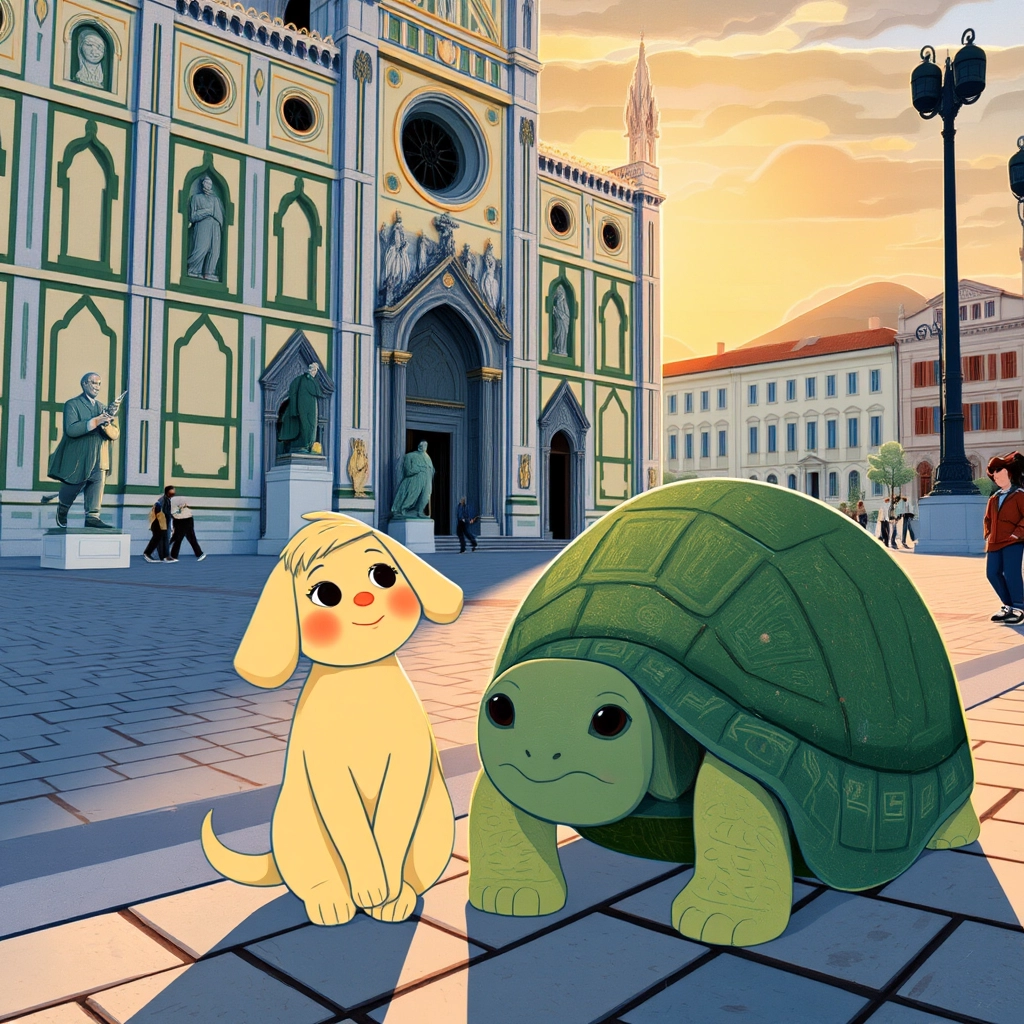 Mell made new friends everywhere he went. In Florence, he met an old, wise turtle named [Enzo](PP5BMJW3) who taught him all about famous Italian artworks.
