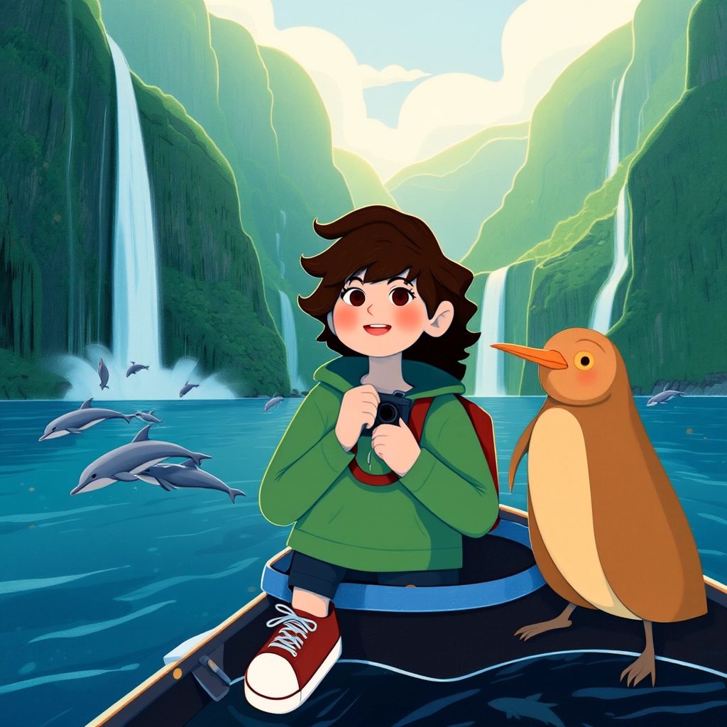 Then, on to Milford Sound! Towering cliffs rose around them as dolphins leapt beside the boat. "This fjord is one of the world’s wonders," said [Kiwi](Y3PV9KSQ). [Liv](KRPWPQQV) snapped photos of the reflections in the calm water.
