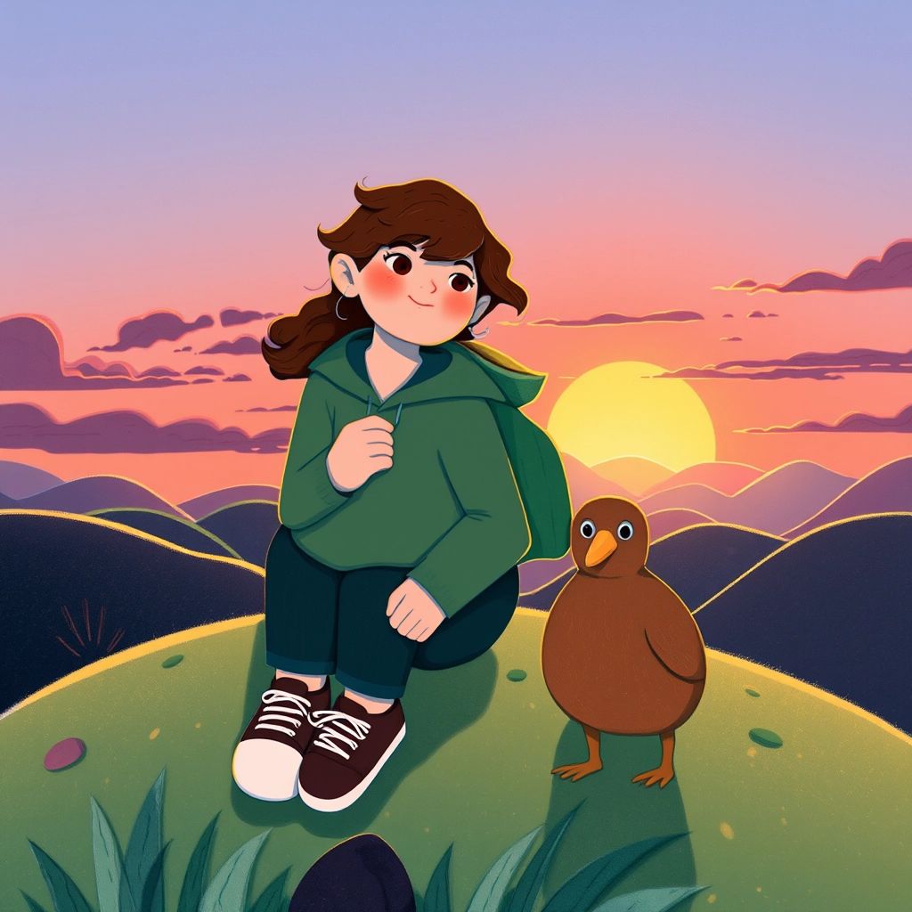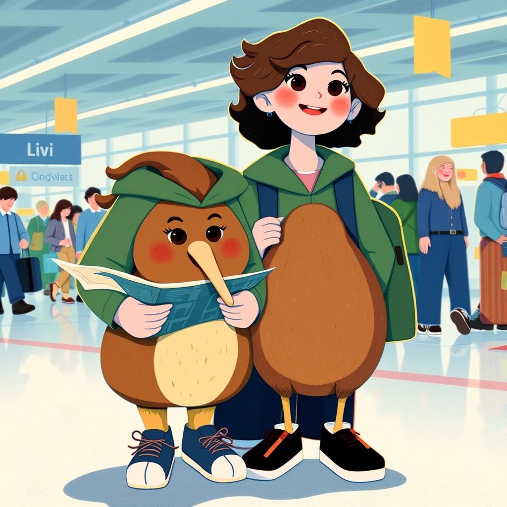 At the airport, [Liv](KRPWPQQV) met her new guide, [Kiwi](Y3PV9KSQ) the bird. [Kiwi](Y3PV9KSQ) was small, brown, and round with a long beak and kind eyes. "Welcome to New Zealand!" said [Kiwi](Y3PV9KSQ). "Let’s explore nature and meet my friends!"