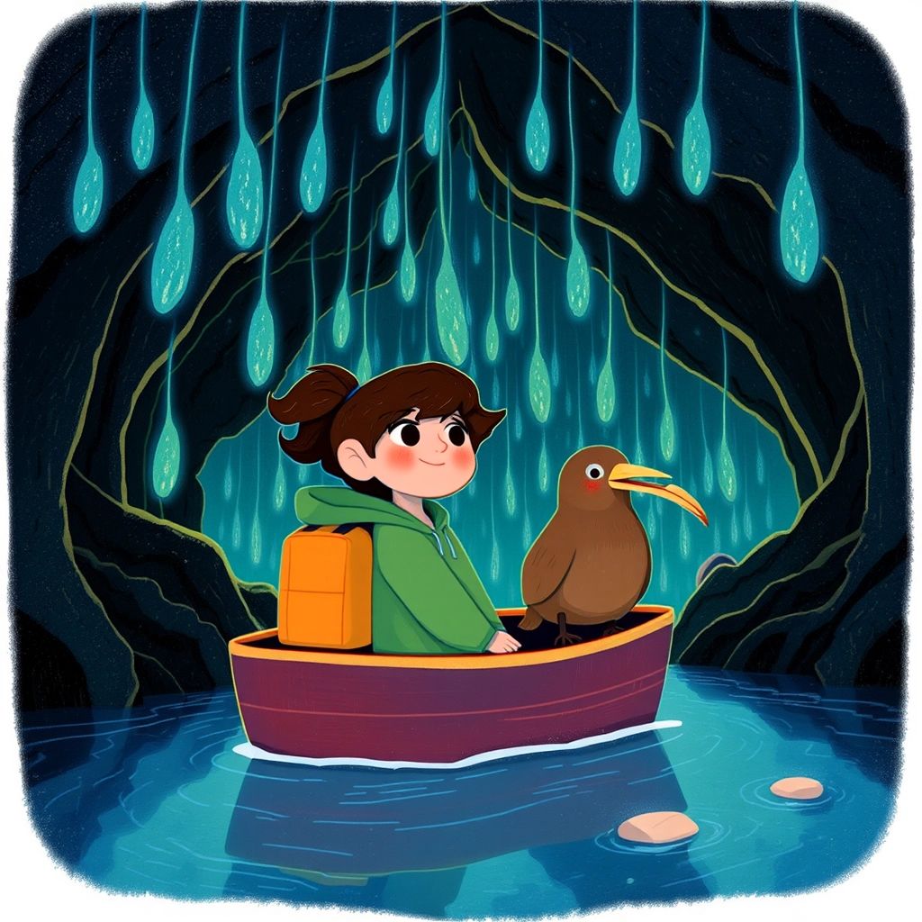 Their first stop was a glowing cave! “This is the Waitomo Glowworm Cave,” said [Kiwi](Y3PV9KSQ). Inside, glowing dots lit up the dark like tiny stars. [Liv](KRPWPQQV) gasped in wonder. "These glowworms are nature’s lights!" said [Kiwi](Y3PV9KSQ).