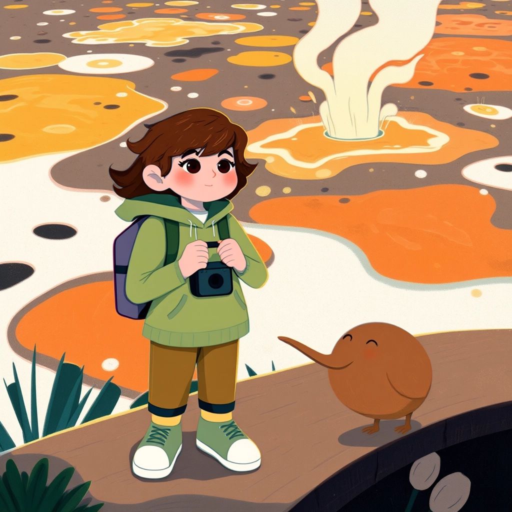 Next, they visited Rotorua, where bubbling hot springs and mud pools made the ground steam. “Be careful, [Liv](KRPWPQQV). This geothermal area is amazing!” [Kiwi](Y3PV9KSQ) said. [Liv](KRPWPQQV) could feel the warm mist on her face.