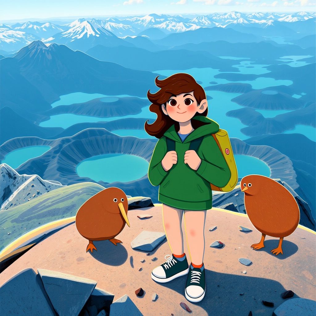 [Liv](KRPWPQQV) and [Kiwi](Y3PV9KSQ) hiked up Tongariro Mountain next. The view at the top was amazing—volcanic craters and turquoise lakes surrounded them. "It’s like standing on a new planet!" [Liv](KRPWPQQV) laughed.