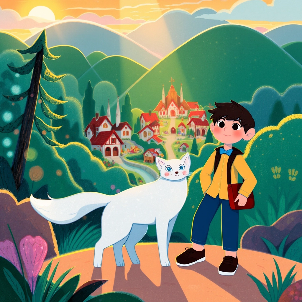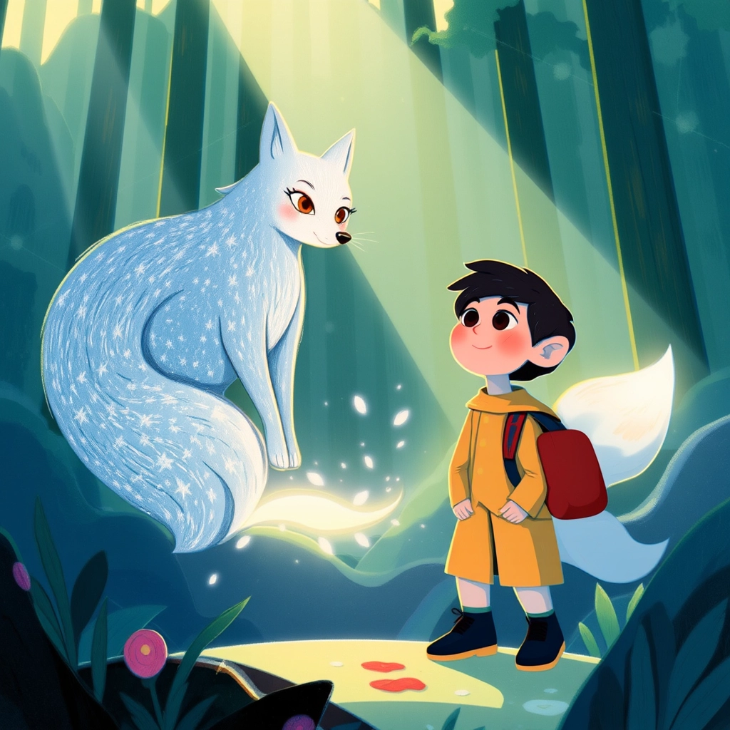 Just as he began to cry, a soft, glowing light appeared before him. From the light emerged a kind, gentle helper—a magical fox with shimmering silver fur and bright, twinkling eyes.