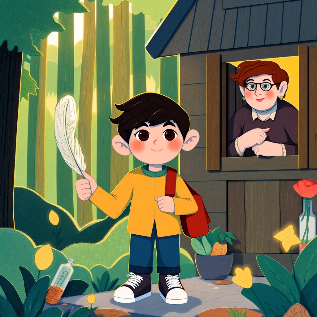 When [Izzy](3RKPVT4M) reached home, he remembered to thank the fox. But when he turned around, the magical helper had disappeared, leaving behind a single silver feather as a keepsake.