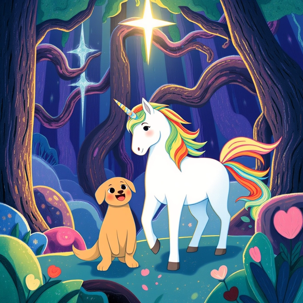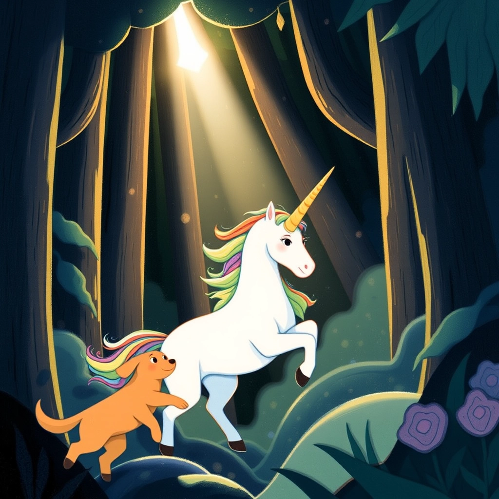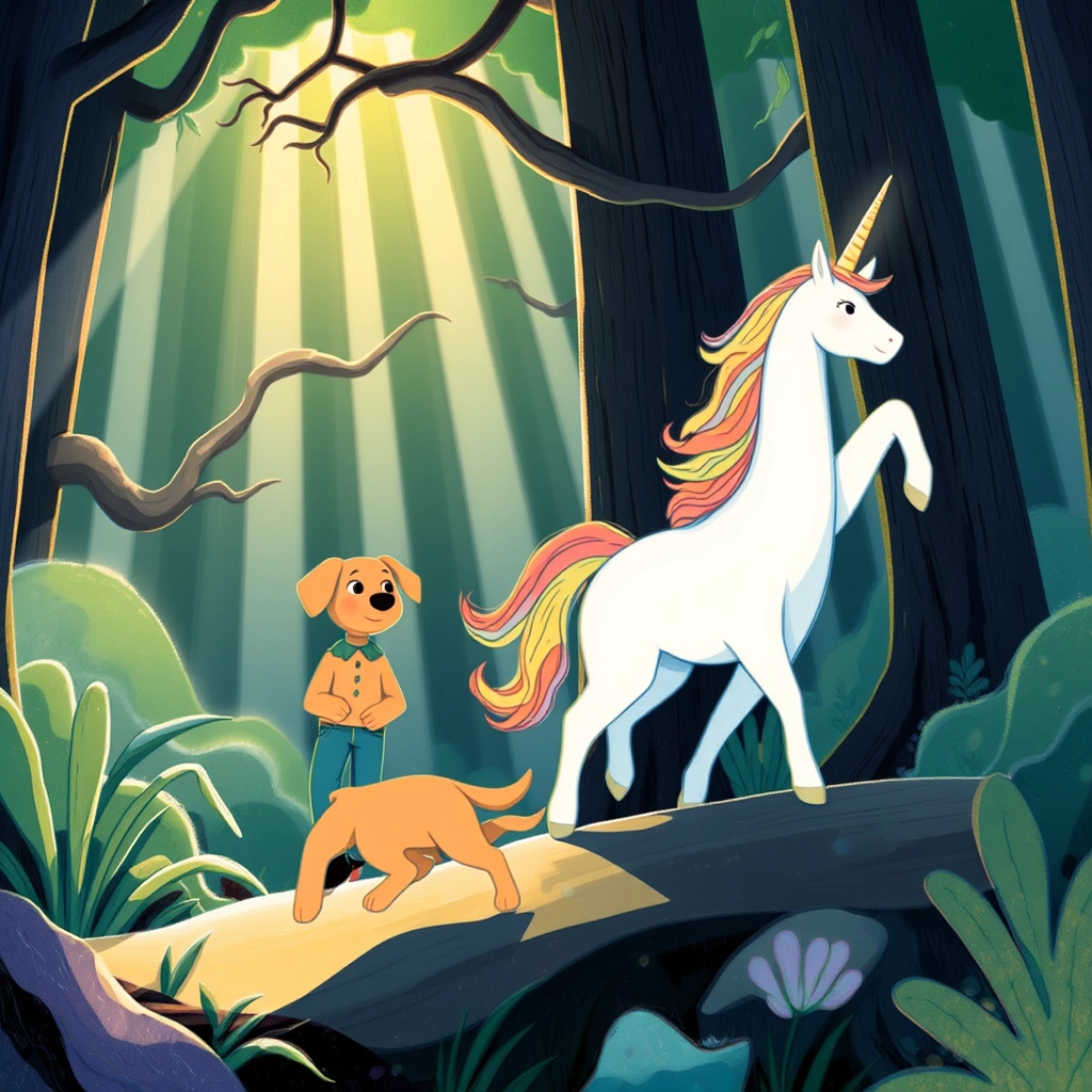 Once upon a time, a shiny white unicorn named [Starbeam](WB5TY5W5) and his best friend, [Jake](CJT9WYYT) the Labrador, were wandering the edge of the Enchanted Forest. The forest was full of sparkling leaves and swaying trees, but deep within, an eerie darkness loomed.