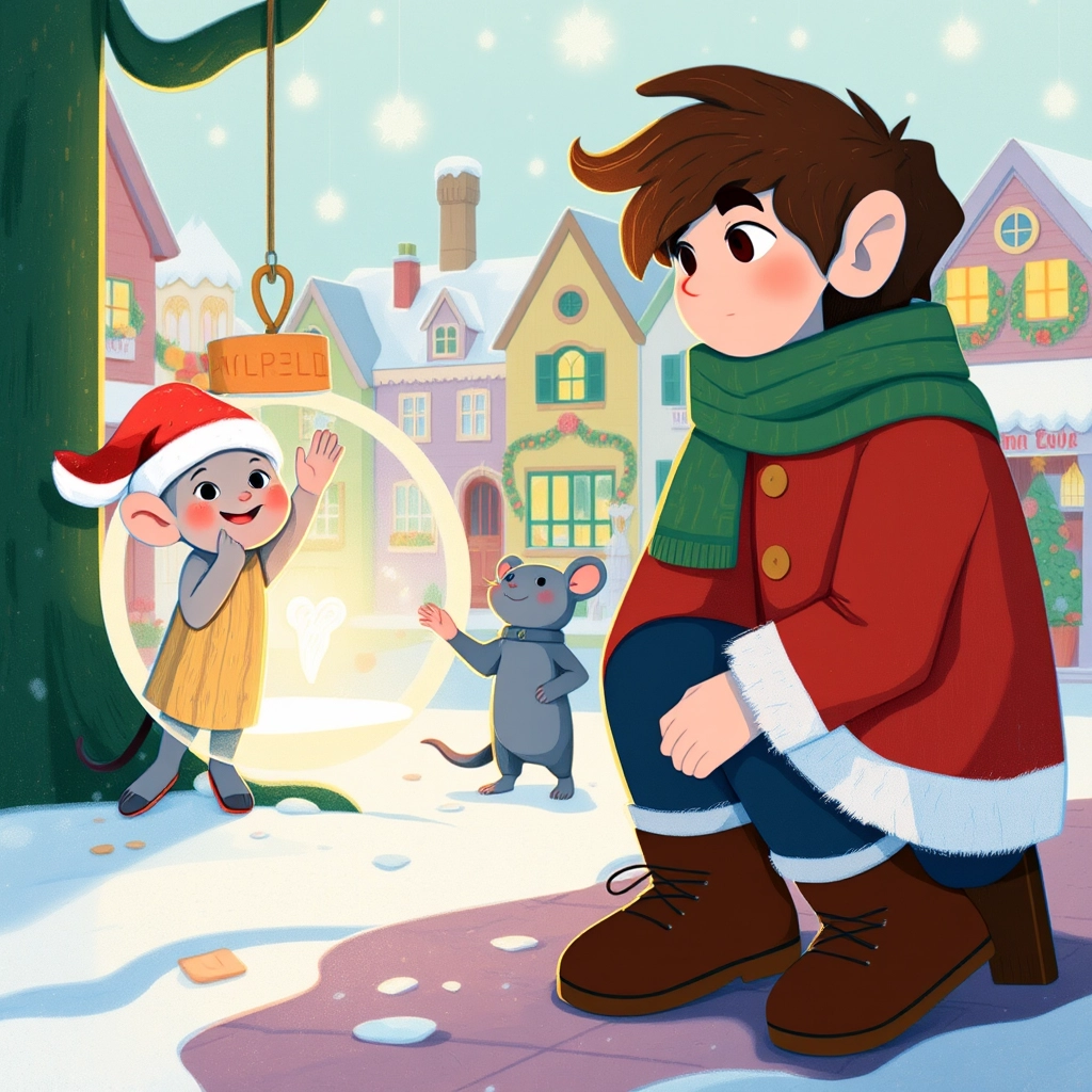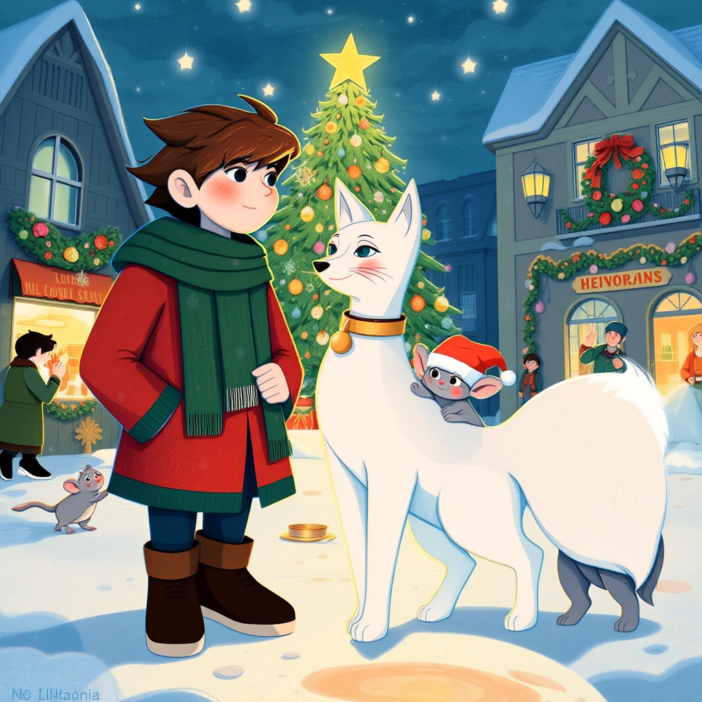 It was the night before Christmas, and [Louis](KRGPYD4J), a cheerful boy with twinkling eyes and rosy cheeks, bundled up in his red coat and green scarf, ran excitedly through the snowy streets of Hollydale. The town was decorated with colorful lights, and the air smelled like hot chocolate and pine trees.