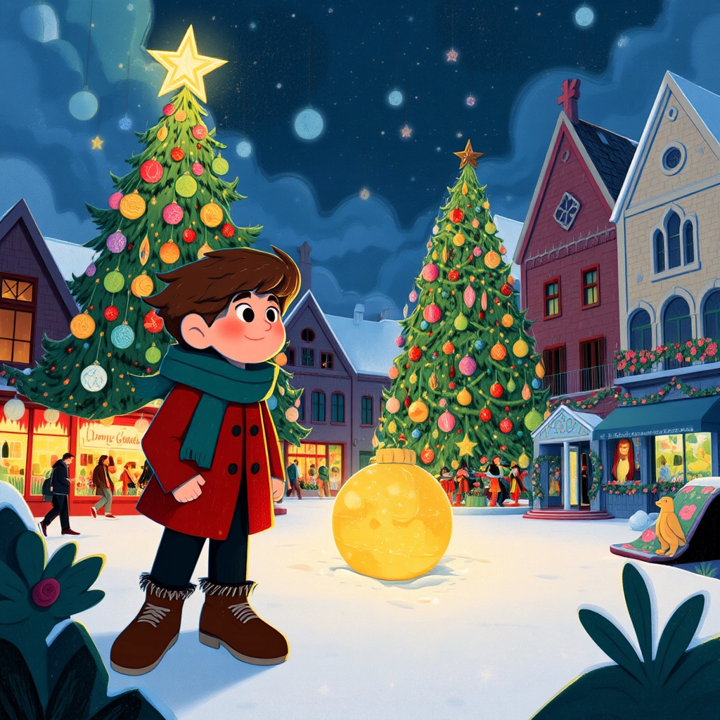 As [Louis](KRGPYD4J) reached the town square, he spotted the shimmering Christmas tree standing tall and glorious, its golden star shining brightly. Beneath the tree, he noticed a shiny golden ornament that seemed to glow with a magical light.