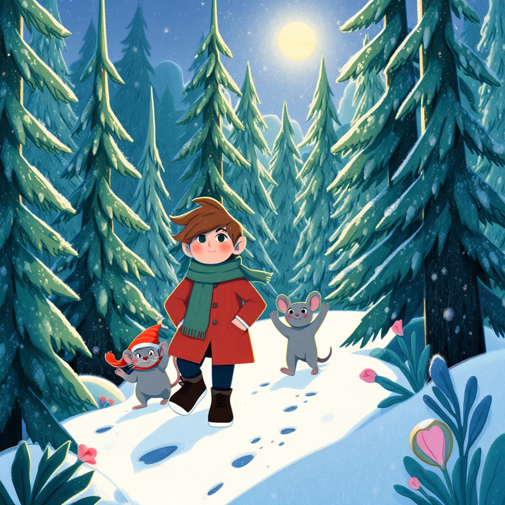 [Louis](KRGPYD4J), [Max](YXZ7F7RL), and [Lila](HKMZYS29) set off through the snowy forest just outside the town. The tall pine trees sparkled with frost, and a light blanket of snow crunched under their feet and paws. They were looking for clues about the missing Christmas magic.