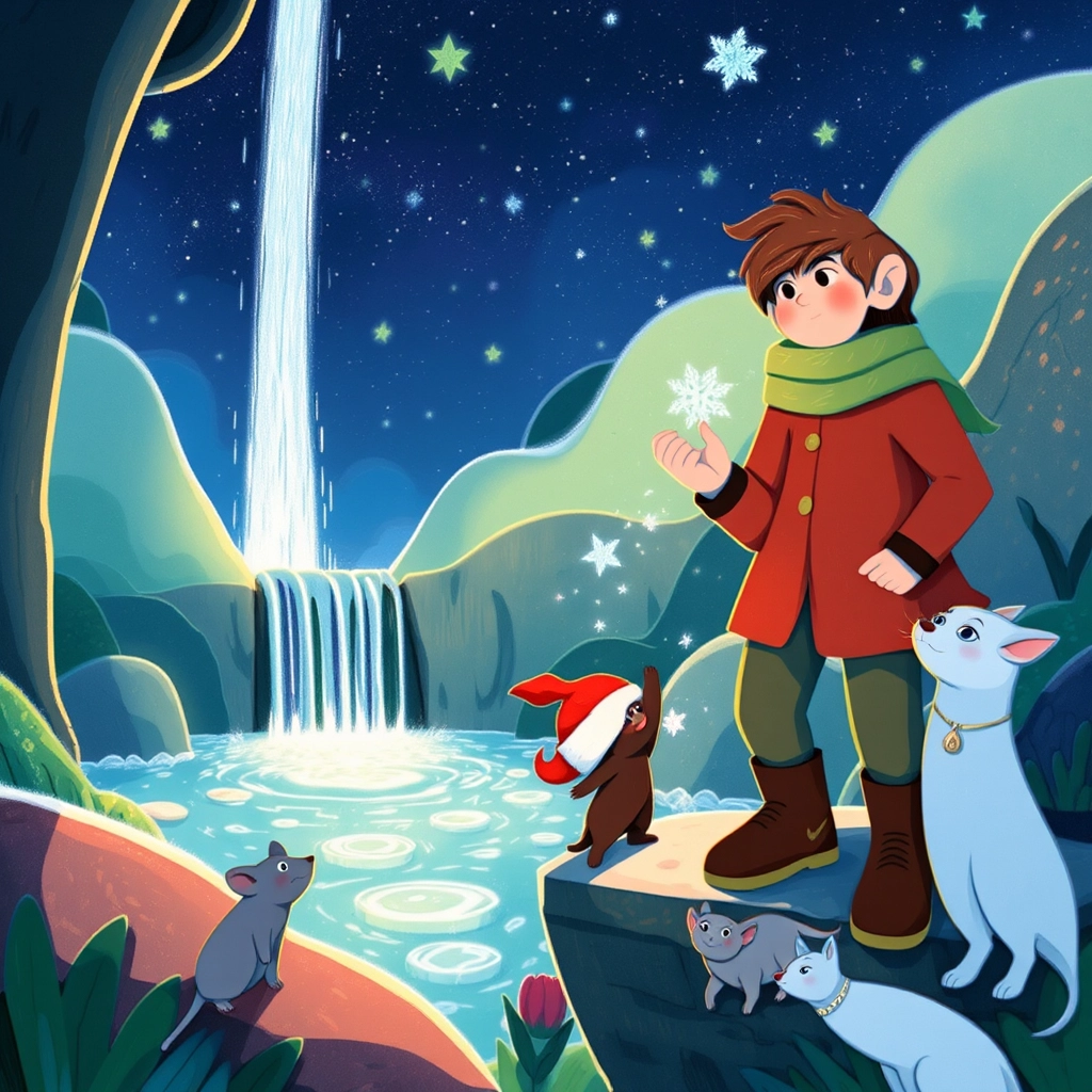Using the charm’s magic, they found a hidden glen where a starlit waterfall shimmered. [Lila](HKMZYS29) whispered, 'Drop the charm into the water to bring Christmas magic back.' [Louis](KRGPYD4J) gently dropped it in, and the water lit up like fireworks!