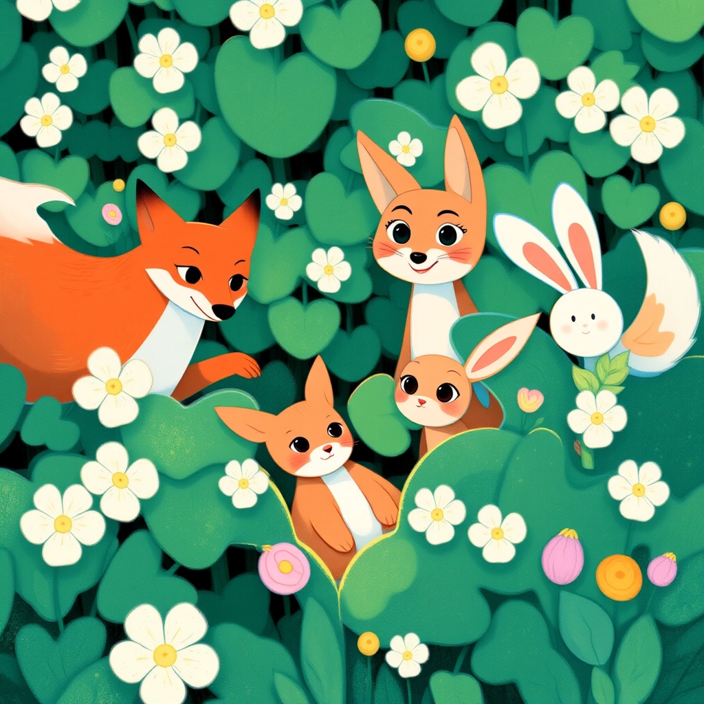 Suddenly, they heard the tiniest giggle. Tucked between the clovers was a baby bunny with fur as white as clouds.