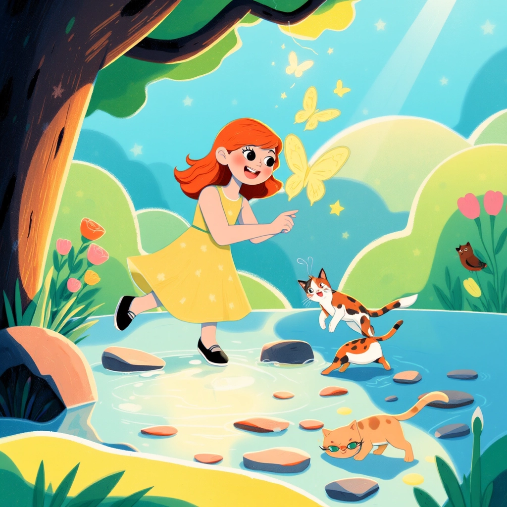 [Lucy](YGMZYJGK) and [Megsy](6ZRZBCW5) explored the clearing, chasing butterflies and skipping stones on the magical ponds. They felt as if they had stepped into a dream.
