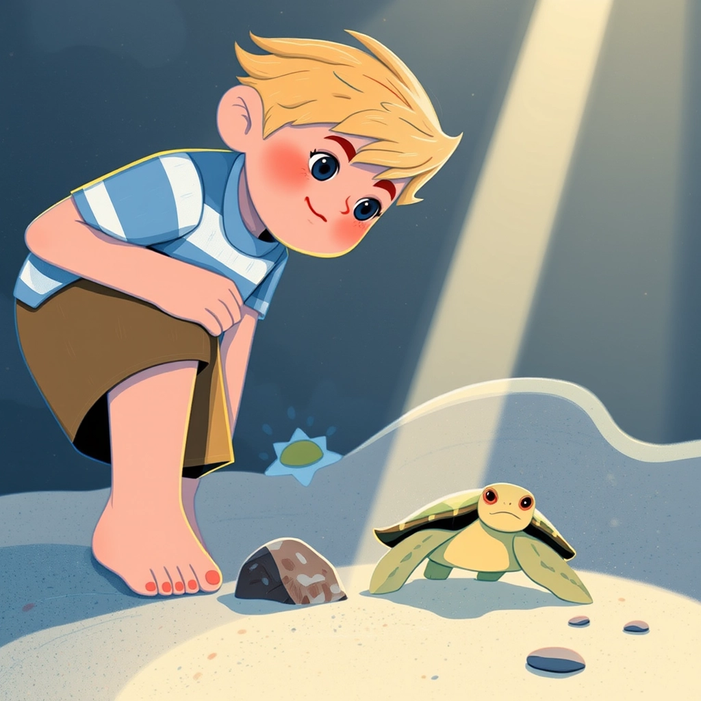 One day, [Luke](5MXPRVTP) saw something moving in the sand. It was tiny, with flippers that looked like little paddles.