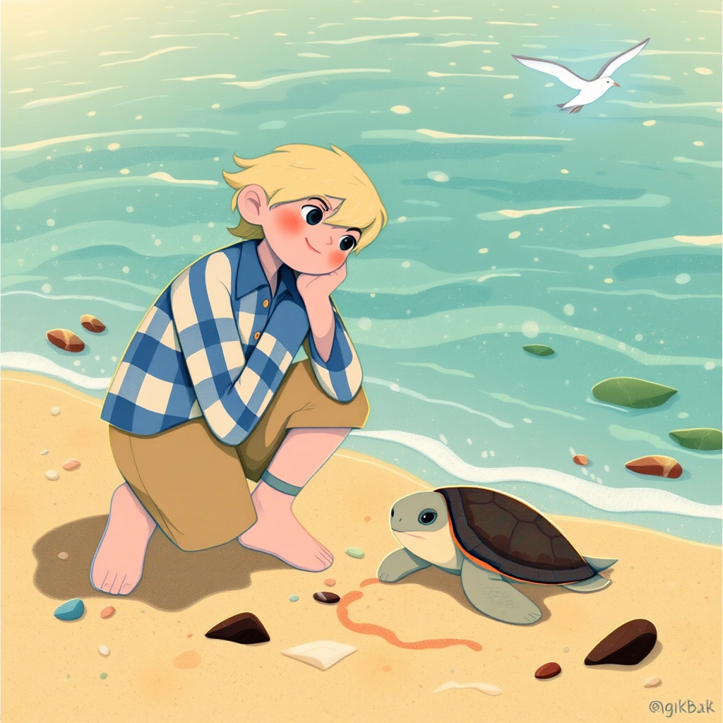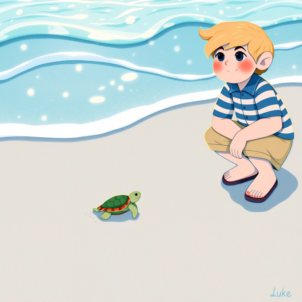 “Go on,” [Luke](5MXPRVTP) cheered softly. The baby turtle flapped its flippers, leaving tiny tracks in the sand.