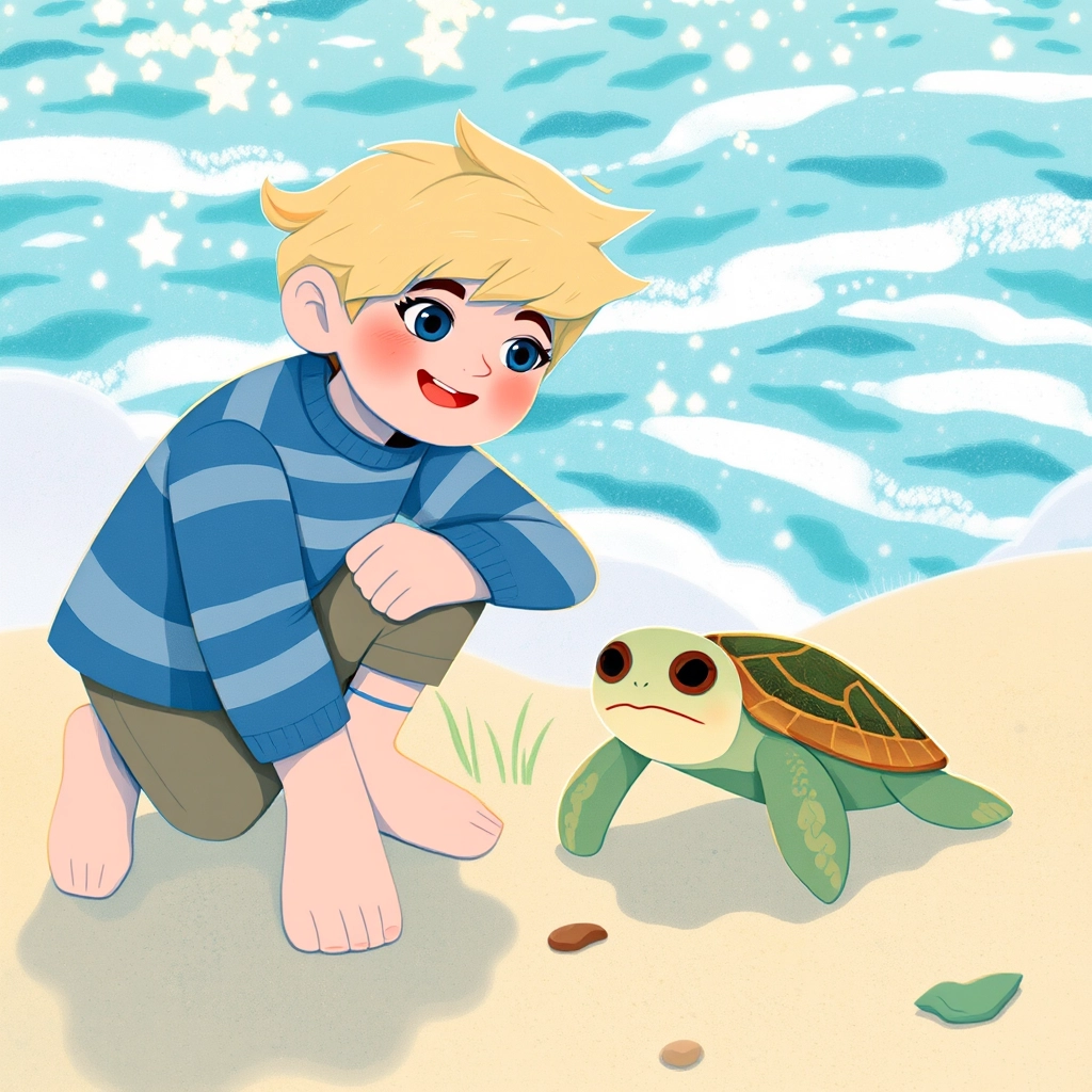 “A turtle!” [Luke](5MXPRVTP) whispered. The baby sea turtle was struggling to reach the water.