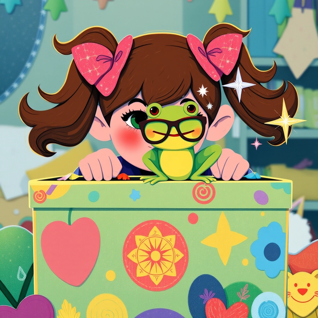 She tiptoed behind her toy box… and saw a little green frog wearing… ✨GLASSES!✨ 'Hi!' said [Lulu](L3XV7F7Z). 'Why are you so bouncy?'