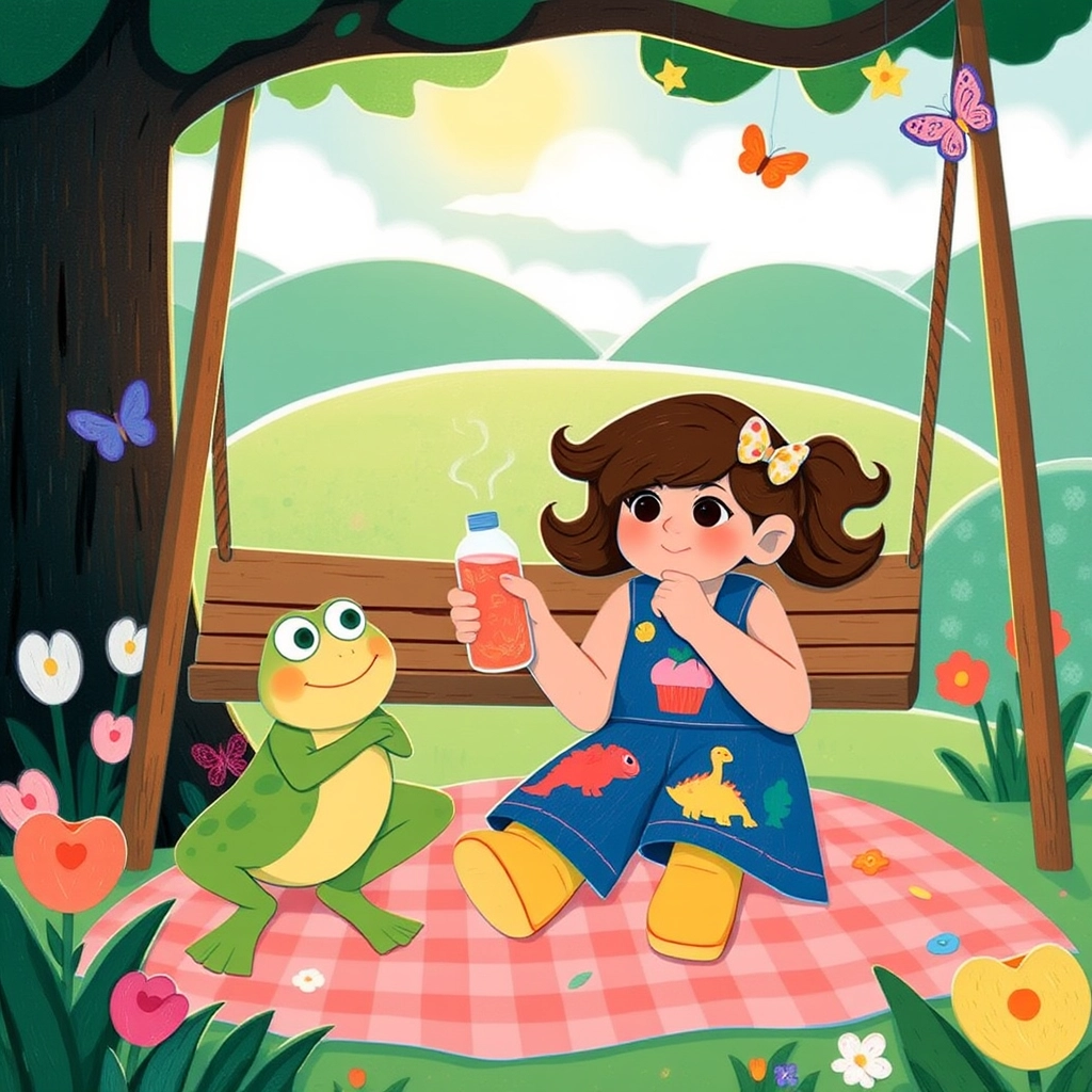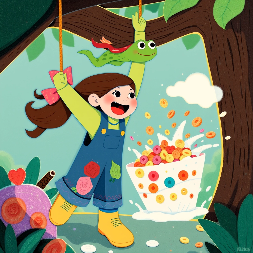 But the frog shouted, 'NO TIME FOR SNACKS! I’M TOO BOUNCY!' He bounced onto [Lulu](L3XV7F7Z)’s head, onto the swing, and into her cereal bowl! SPLASH!