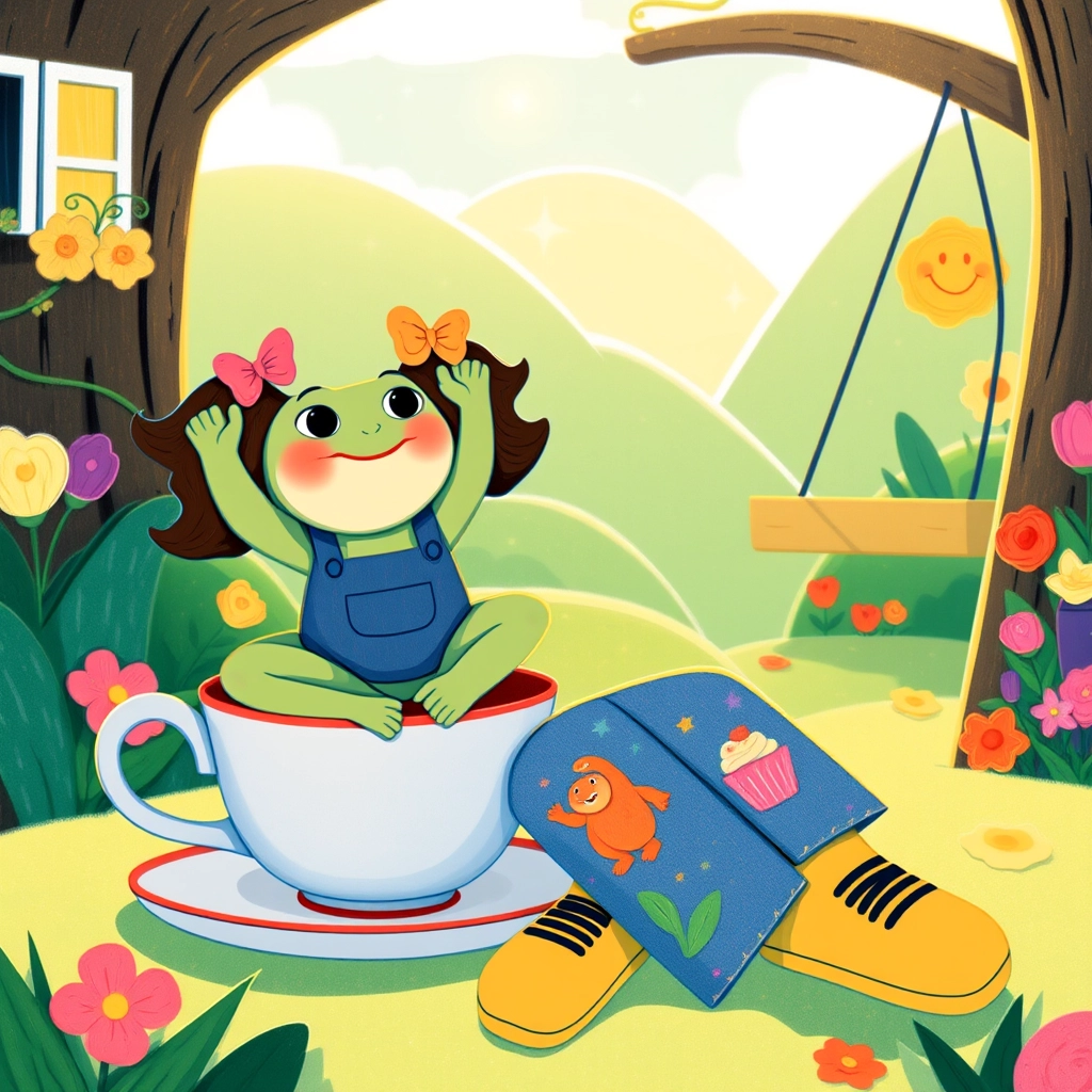 BOOP! He landed in a teacup and stopped bouncing. 'Phew!' said the frog. 'YAY!' said [Lulu](L3XV7F7Z).