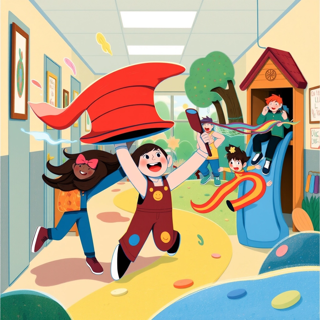 [Lulu](L3XV7F7Z) chased it down the hallway, 'Come back, you silly thing!' The hat did a cartwheel and landed with a bing! It bounced on the teacher, who started to laugh, then slid down the slide with the lunch lady’s scarf!
