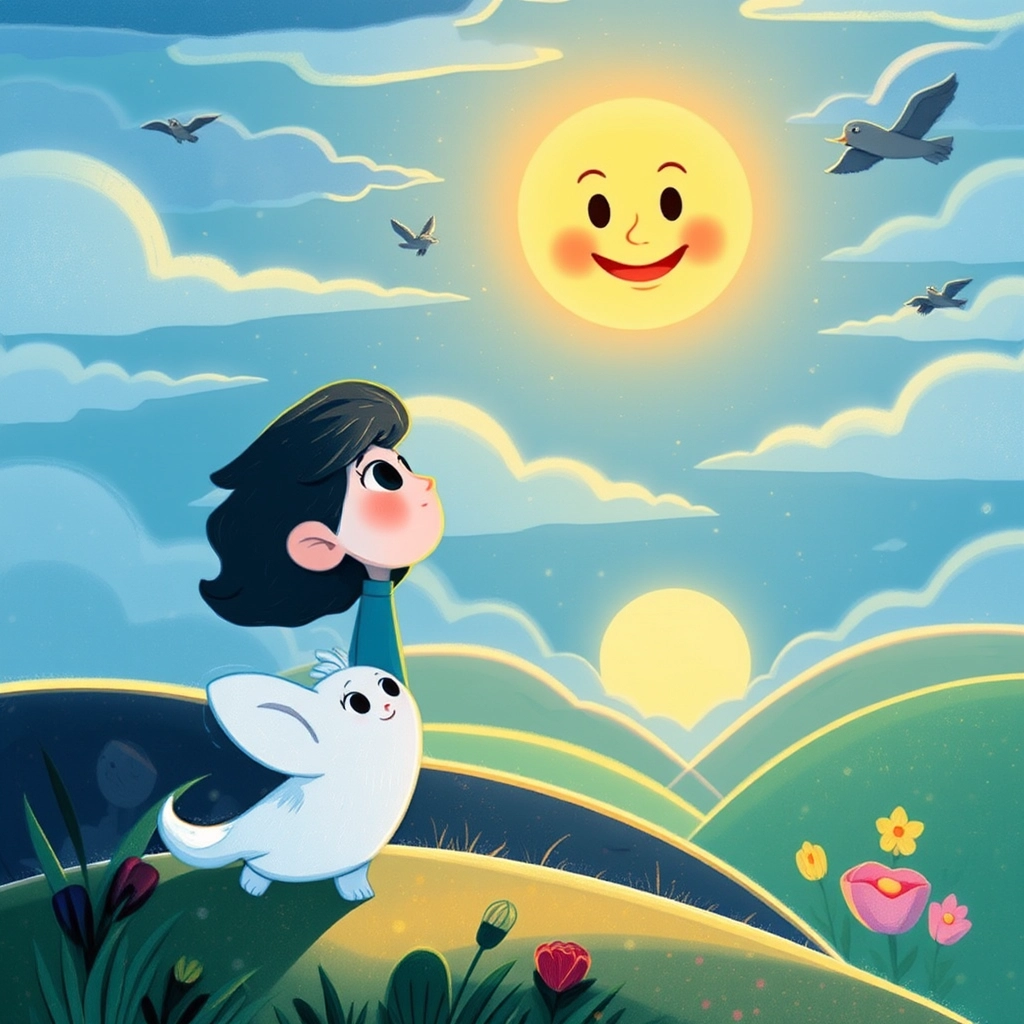 As the day went on, [Luna](RT6W7F6G) met the sun. 'Hello there!' said the sun, shining warmly. 'Where are you going in such a hurry, little one?'