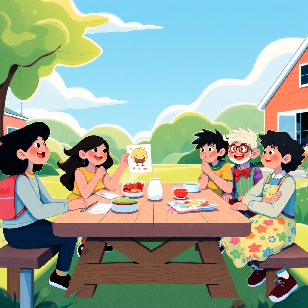 By lunchtime, [Mia](PQ6SZ22J) had a new group of friends. They all sat together sharing sandwiches and stories. [Zara](H4TVZCJP) told a tale about her cat, and [Max](JSKC9K36) demonstrated their silly dance move!