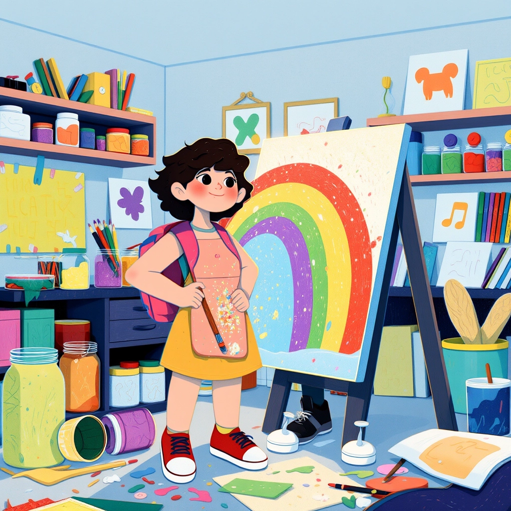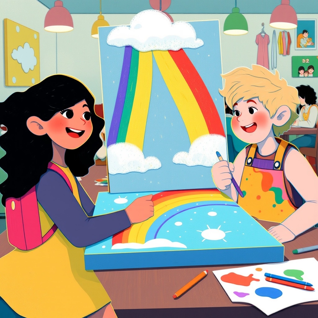 Later that day, [Mia](PQ6SZ22J) joined the painting corner during art time. She noticed another student, [Max](JSKC9K36), painting a beautiful rainbow with glitter. 'Wow, that's amazing!' [Mia](PQ6SZ22J) exclaimed.