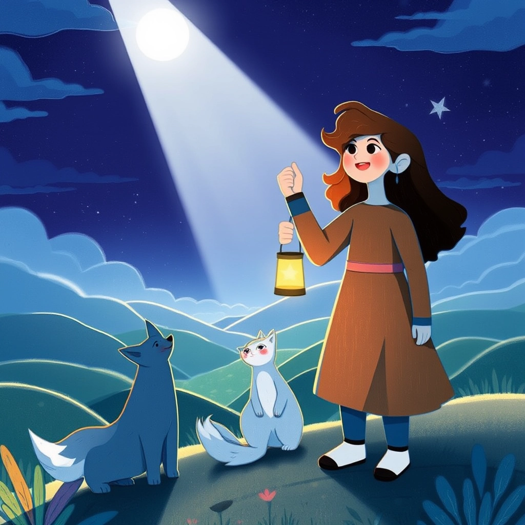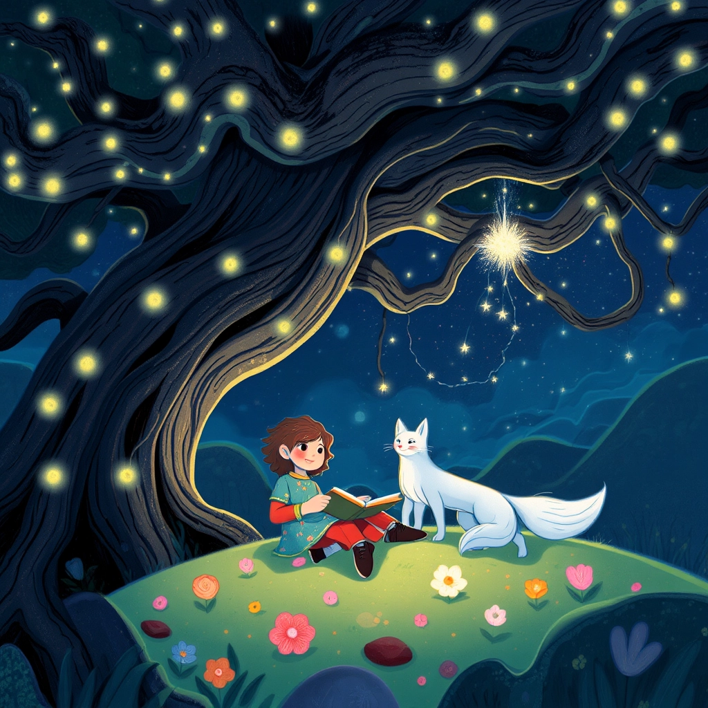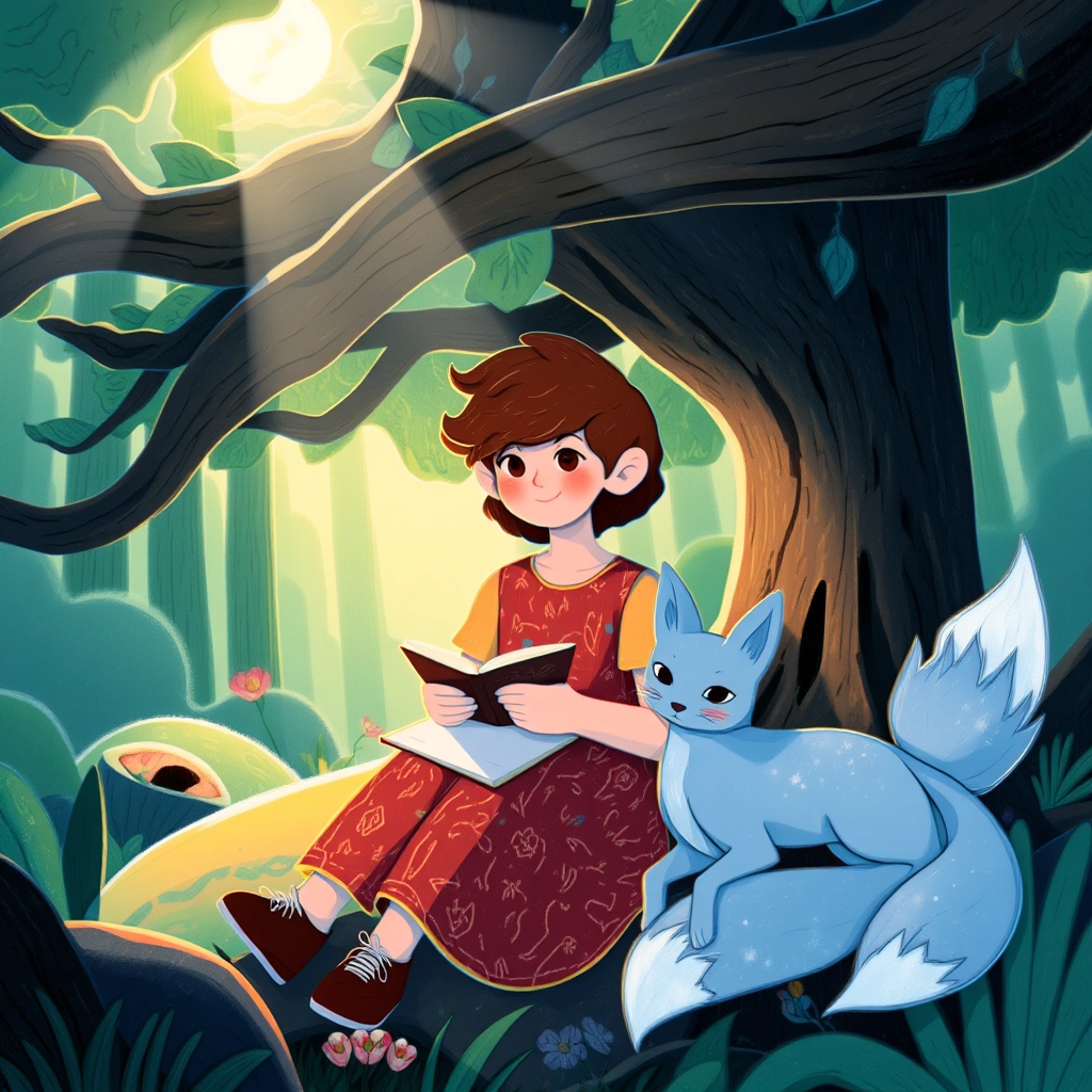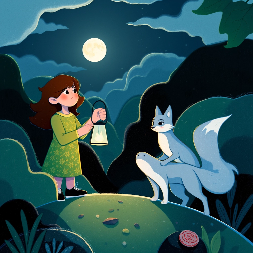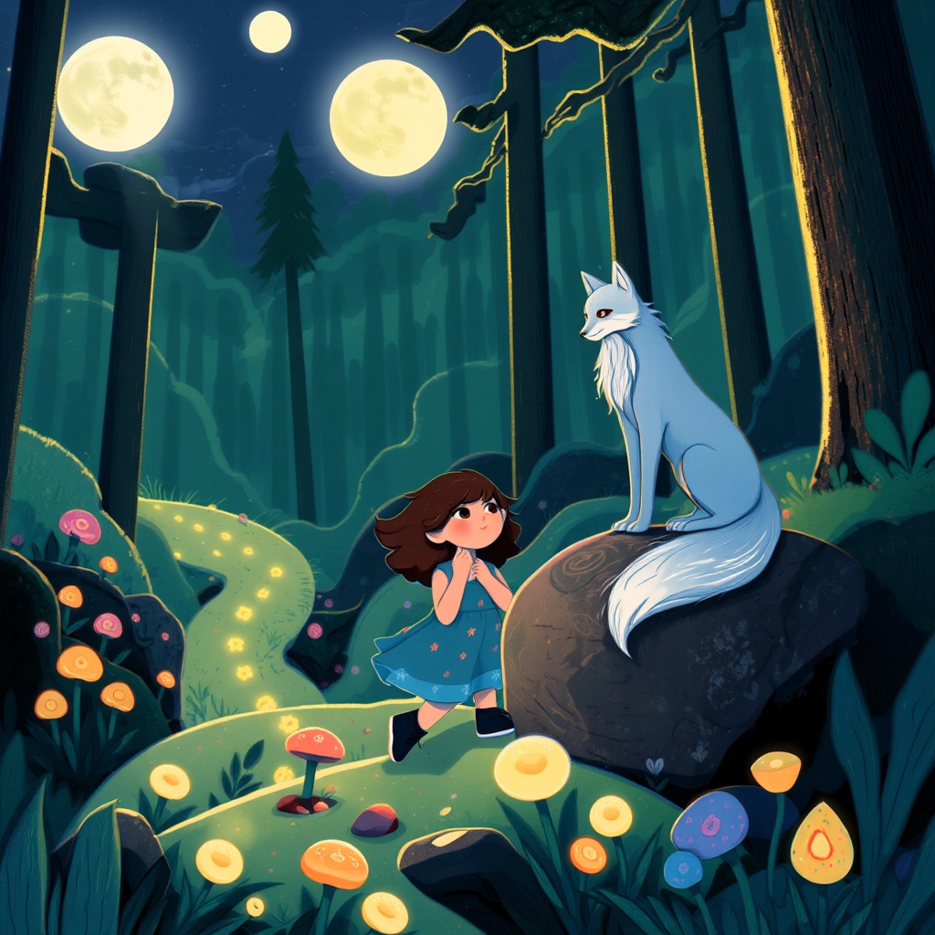 One magical evening, [Maple](72VS5FKF) met [Lumos](BBV9G2F5)—a fox unlike any other. His silvery fur shimmered in the moonlight, and his eyes sparkled like starlight. To [Maple](72VS5FKF)’s astonishment, he spoke! That night, they became the best of friends.