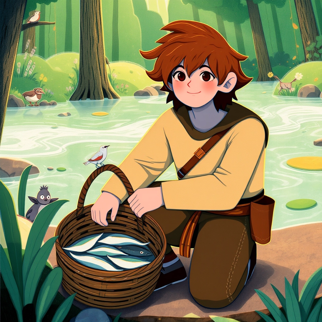 [Marcus](LYDFN59M), strong and kind, often helped his father. He carried baskets, mended nets, and listened to the whispers of the forest nearby.