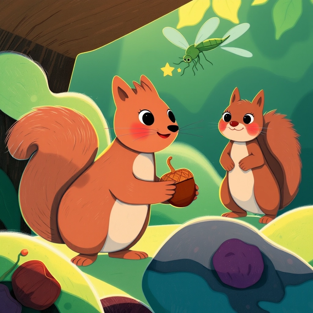 Next, he buzzed to [Sammy the Squirrel](BHGTK7K6). 'Need help collecting acorns?' asked Marvin. 'Hmm, sure,' Sammy replied, curious.