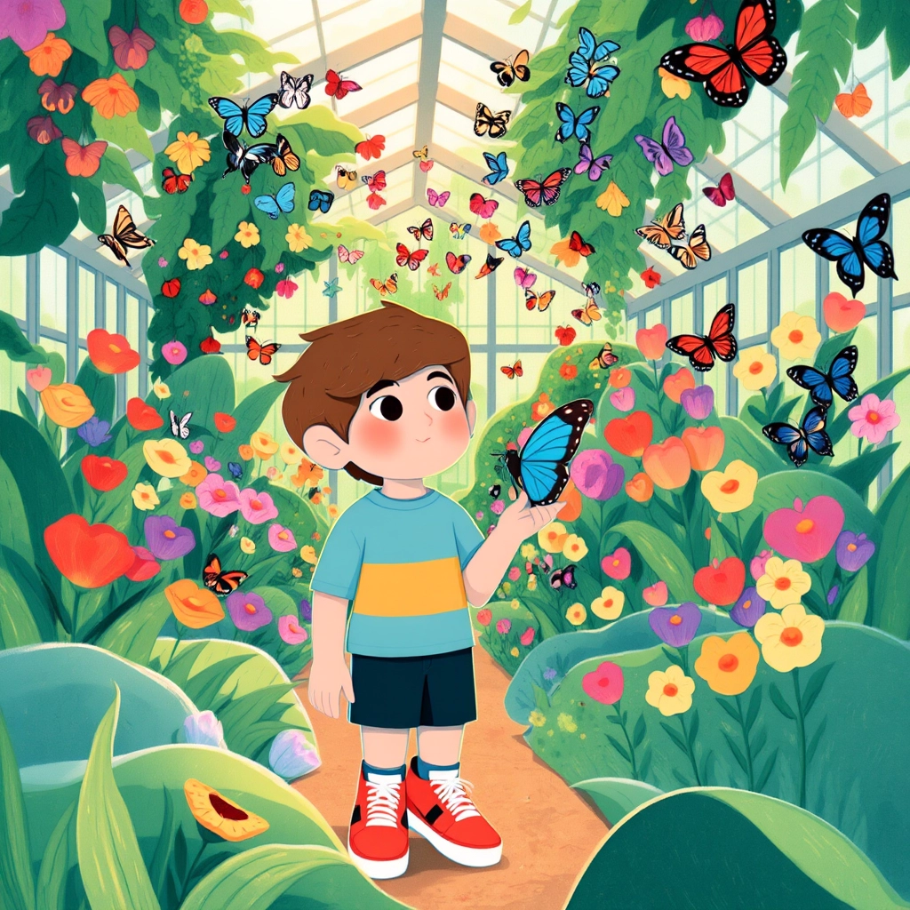 In the butterfly house, colorful butterflies fluttered all around [Mason](TVV566FP), landing on flowers and bushes.