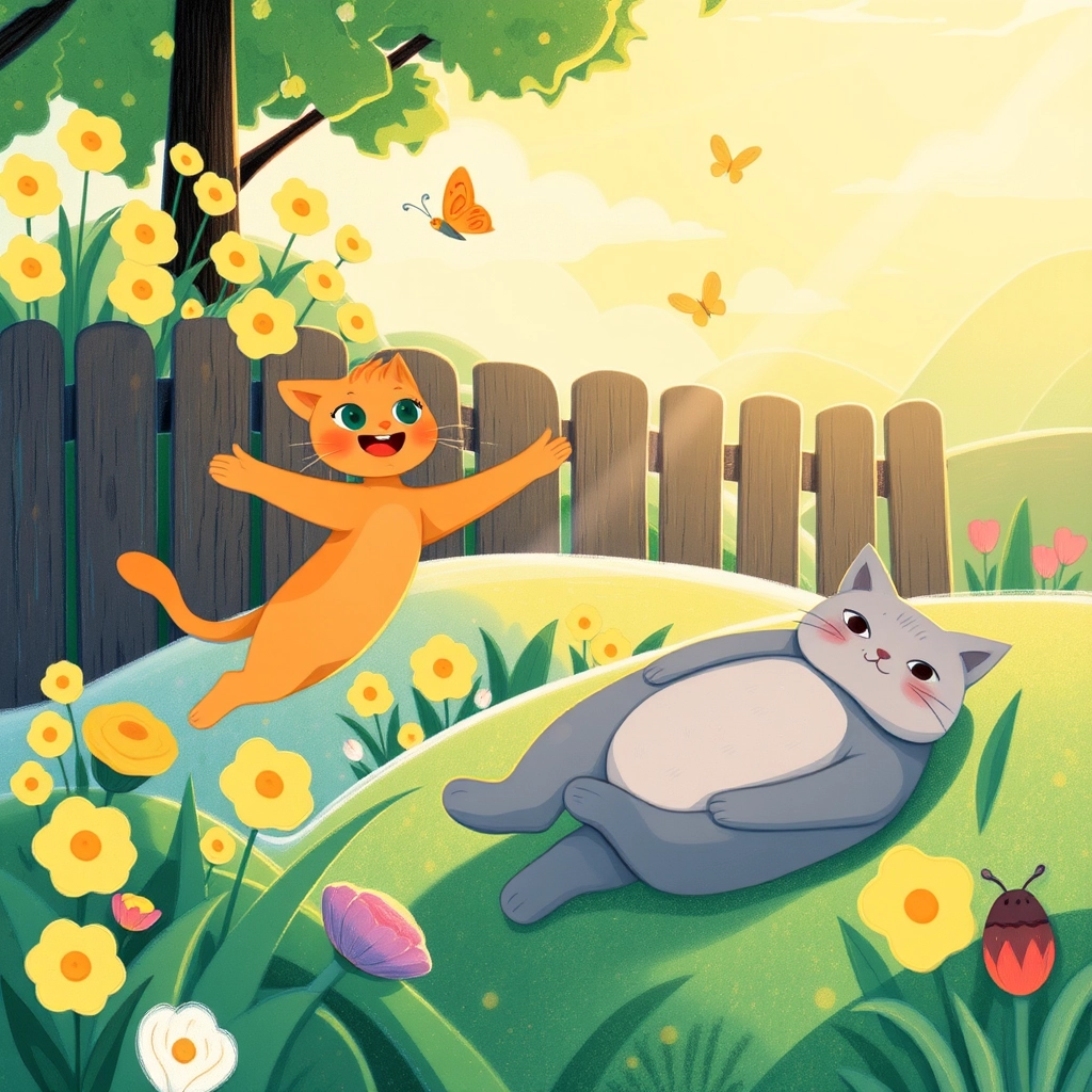 Next, they found a small hole under the fence. “What’s in there?” [Matilda](GX2Y5LMK) wondered. They crawled through… and found a meadow full of yellow flowers. “Wow!” said [Bart](CKHY37VF). “It’s like a cat paradise.” They rolled in the flowers, chased more butterflies, and played hide-and-seek.