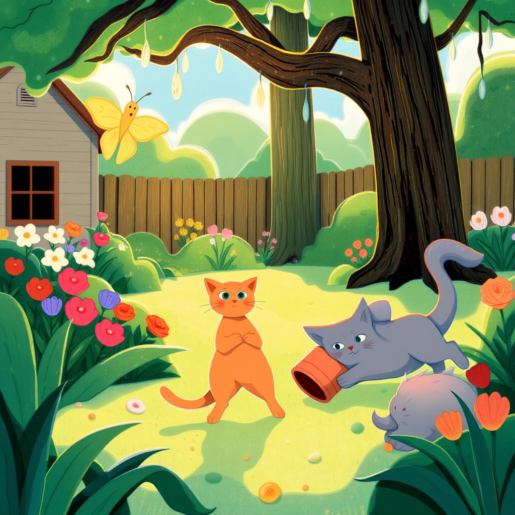 In the garden, the grass was wet with morning dew. [Matilda](GX2Y5LMK) ran to the big oak tree. “Look, [Bart](CKHY37VF)! A butterfly!” she meowed. [Bart](CKHY37VF) chased the butterfly… but tripped over a flower pot. THUMP! [Matilda](GX2Y5LMK) giggled. “You’re so silly, [Bart](CKHY37VF)!”