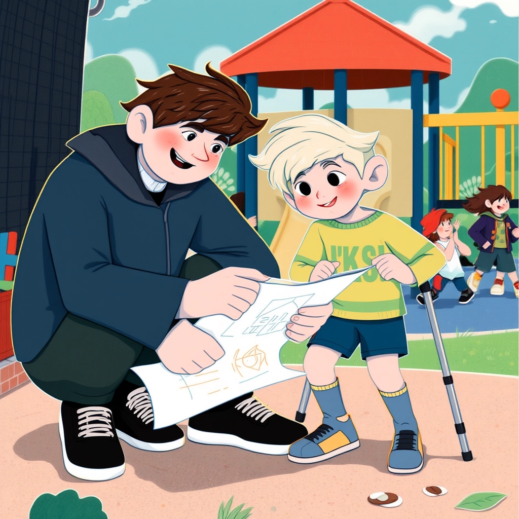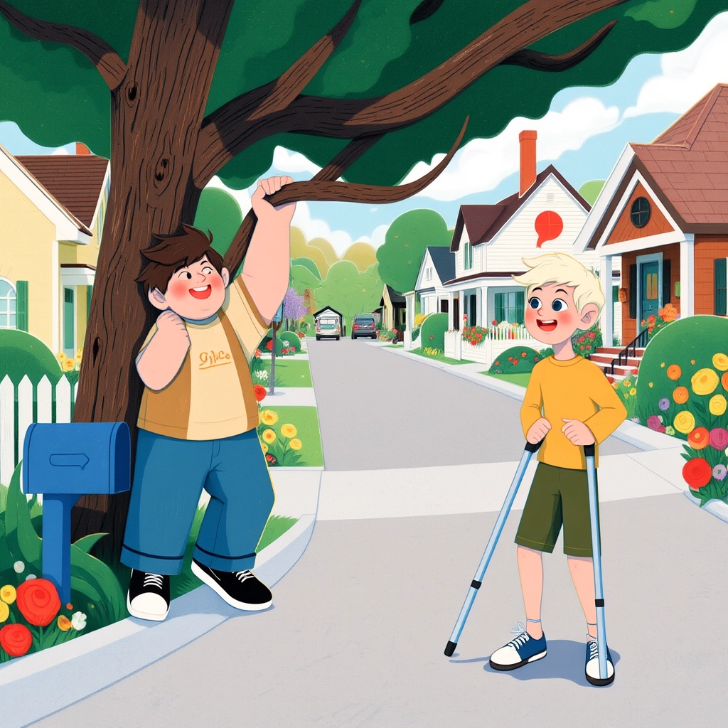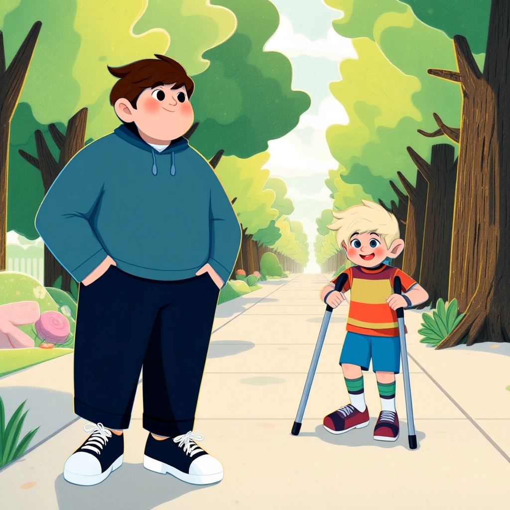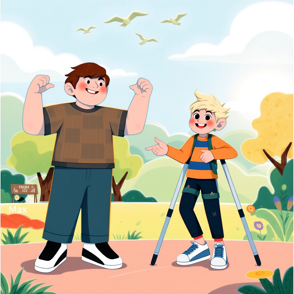 One day, while walking to school, [Max](9KPFB49P) spotted a familiar face. It was [Freak](B4MG67JS)! He remembered him from daycare—the kid with the leg braces and fierce determination in his eyes. [Max](9KPFB49P) had been angry back then, but [Freak](B4MG67JS) didn’t seem to mind.